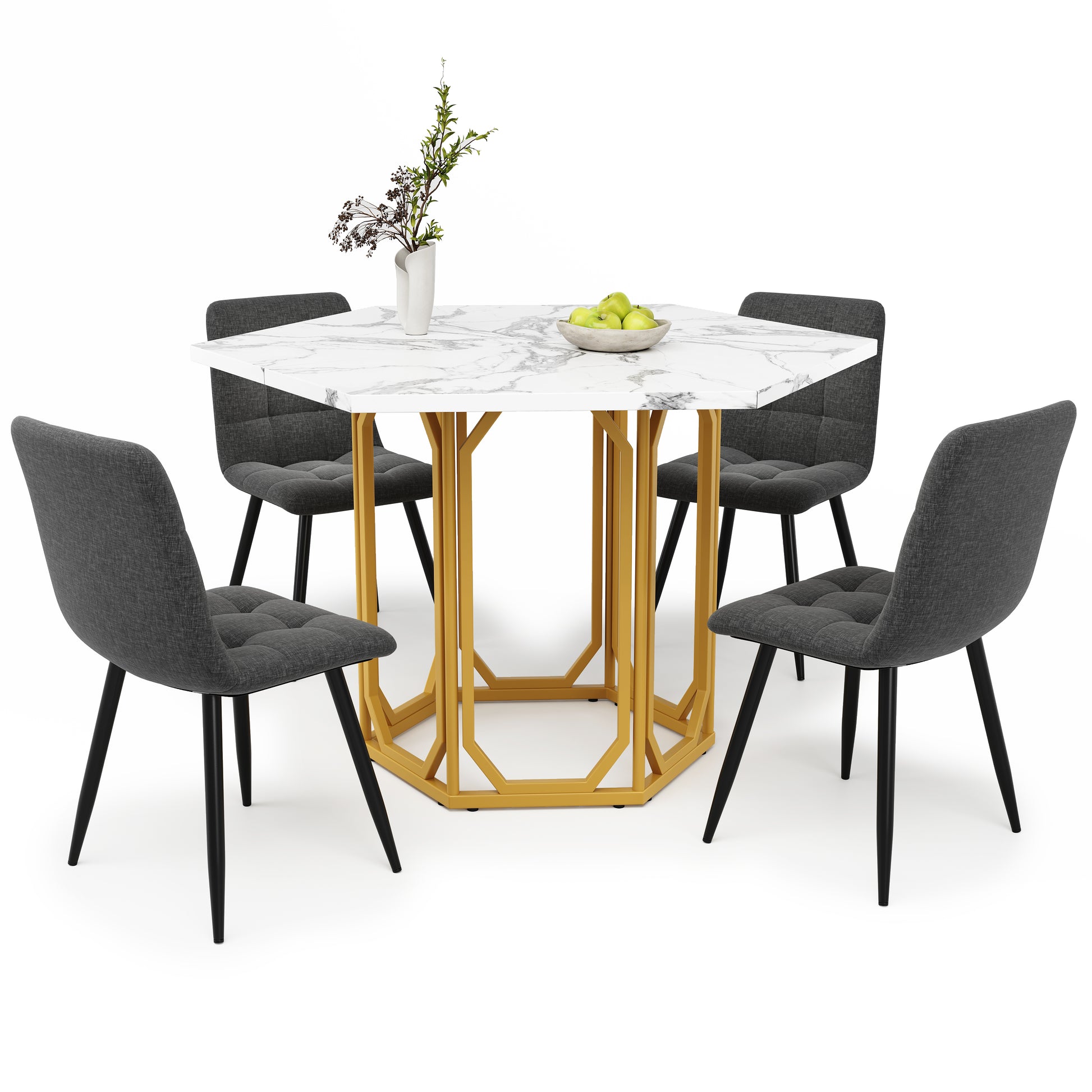 Dining Table Set 5-Piece Hexagonal Marble Top 4 Chairs, Grey