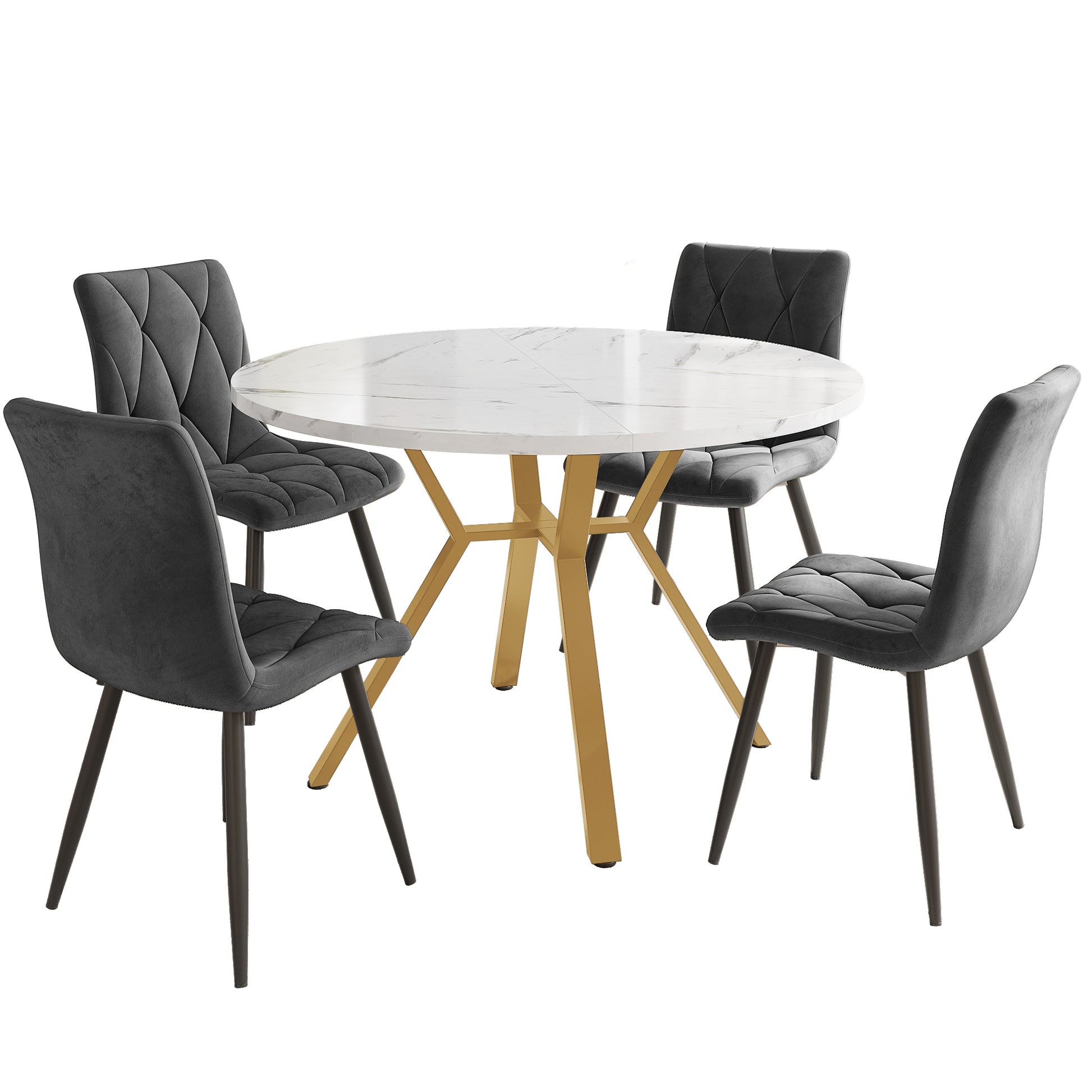 Dining Table Set, 5-Piece Round with Marble Top & Velvet Chairs, Gray