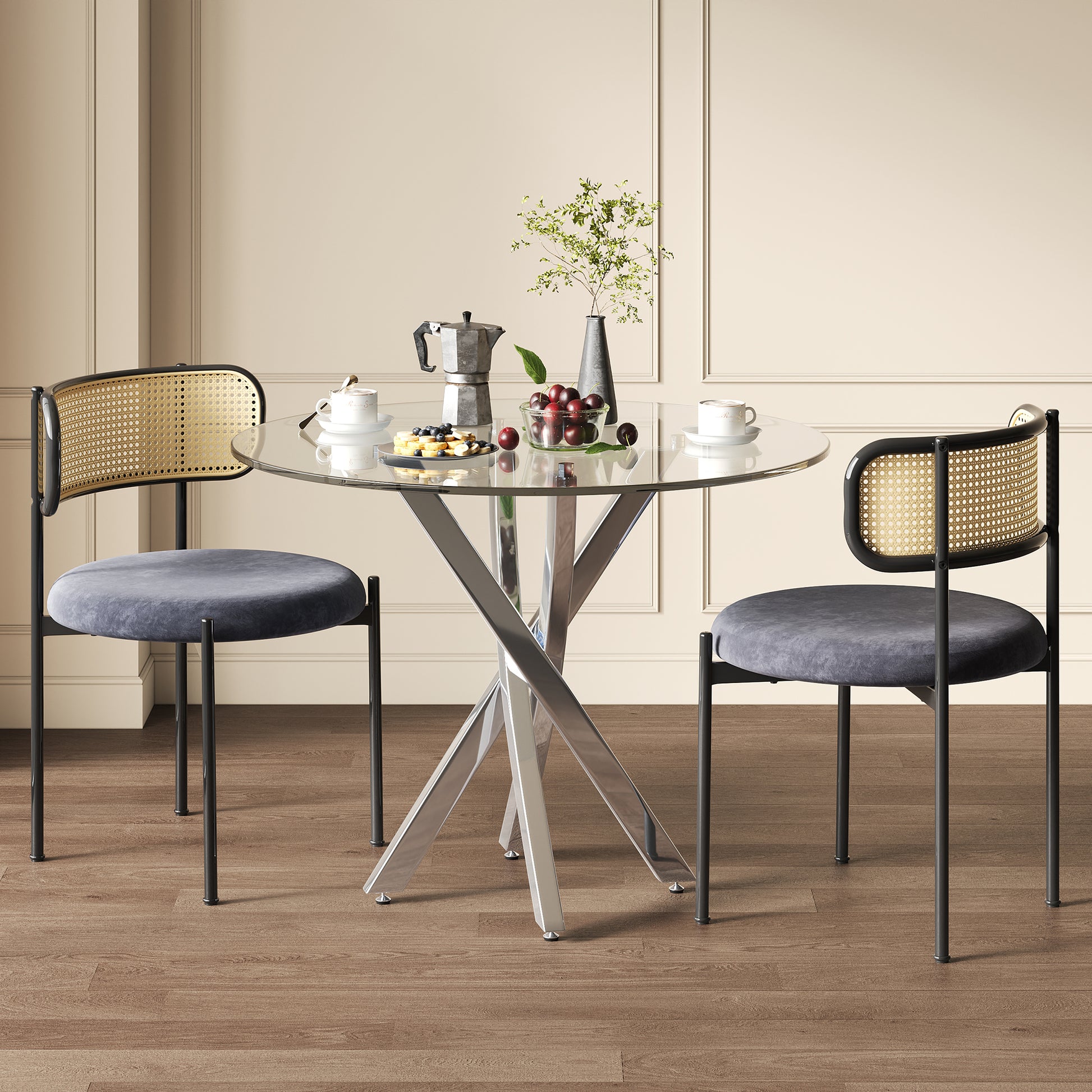 Dining Table Set, 80x80cm Tempered Glass Top, Modern 3-Piece, Grey Chairs/Silver Legs