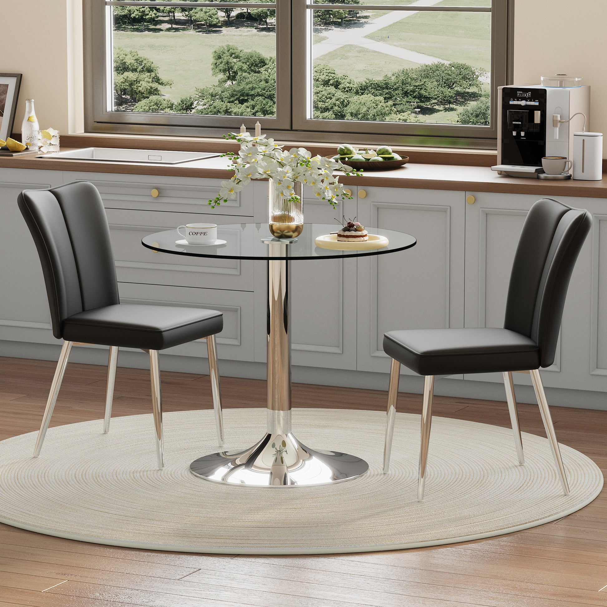 Dining Table Set, 85 cm Tempered Glass Table with 2 Chairs, Black PU