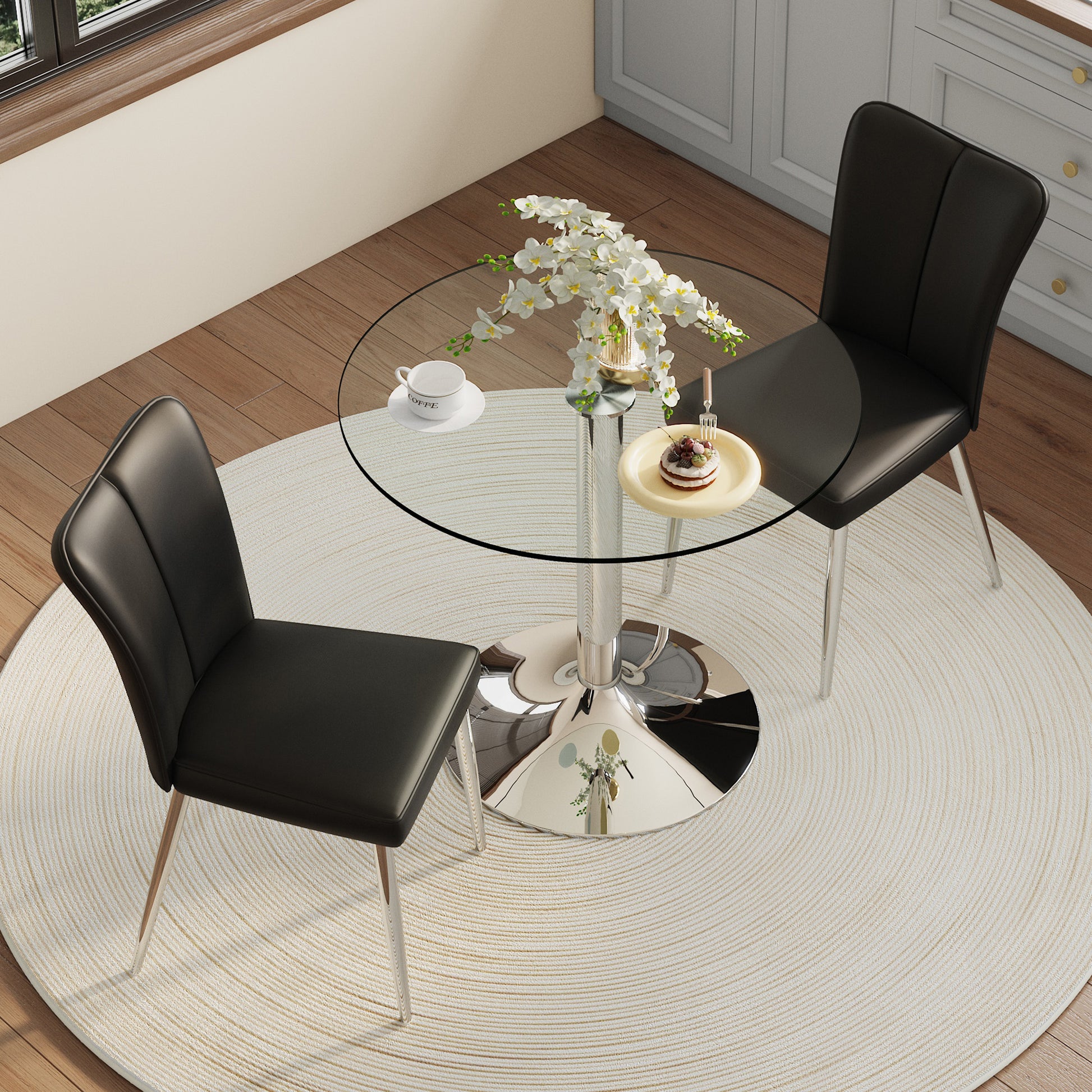 The design, combined with a silver metal base, is simple and sleek. The base diameter is designed to complement the tabletop and provides strong, stable support. It can easily hold items such as drinks and dishes and is resistant to wobbling during use, ensuring safety.