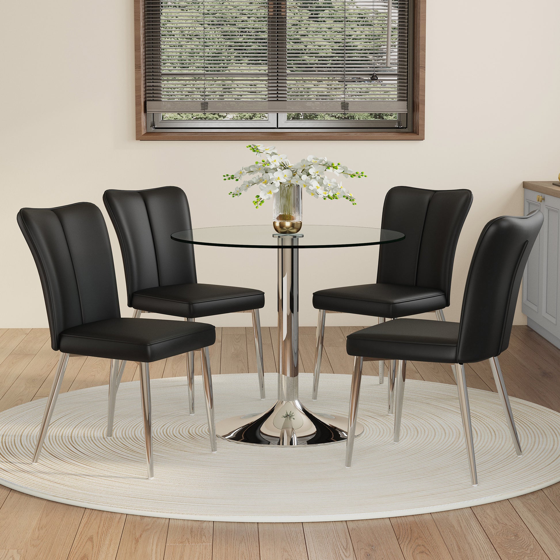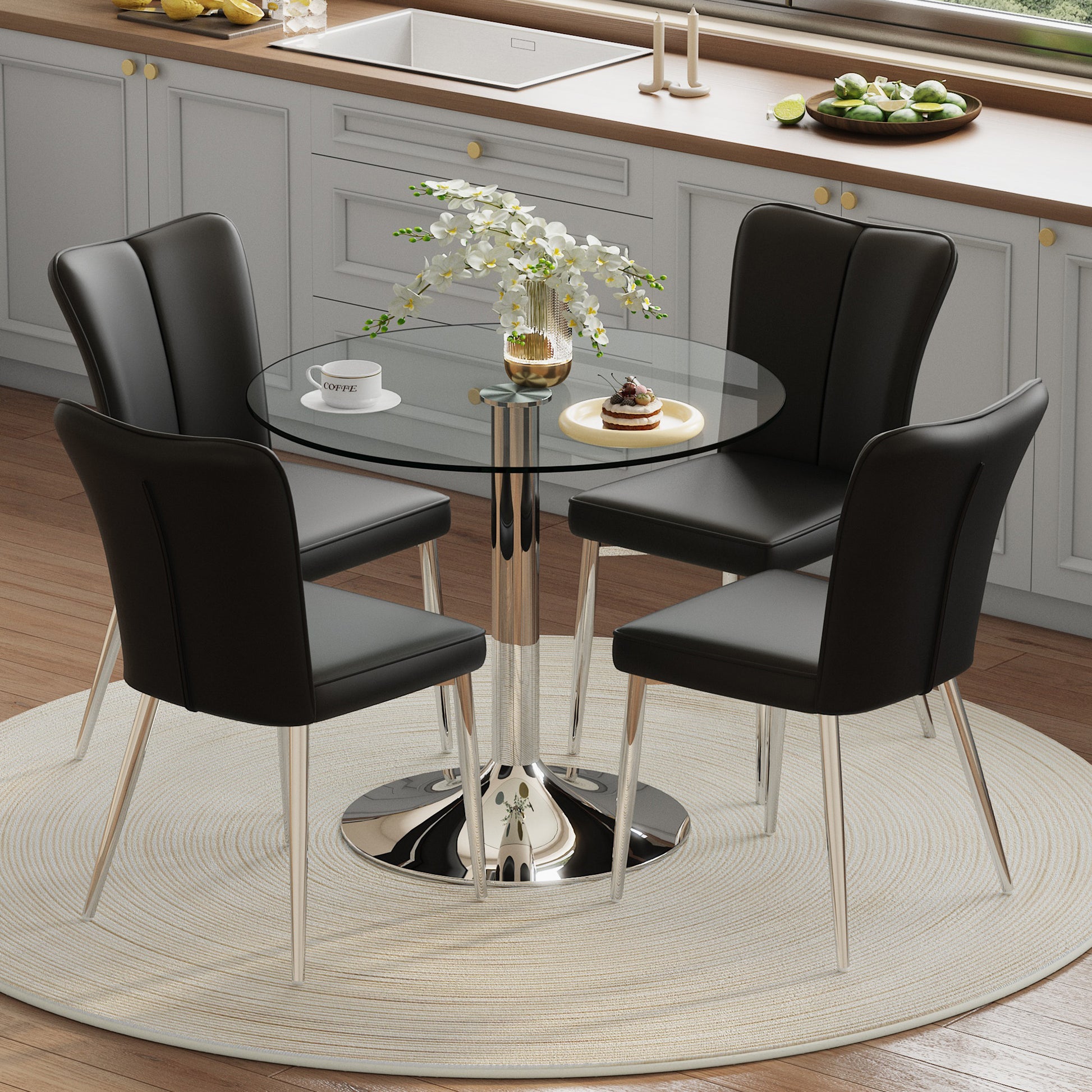 Dining Table Set, 85cm Tempered Glass Table with 4 Chairs, Black PU