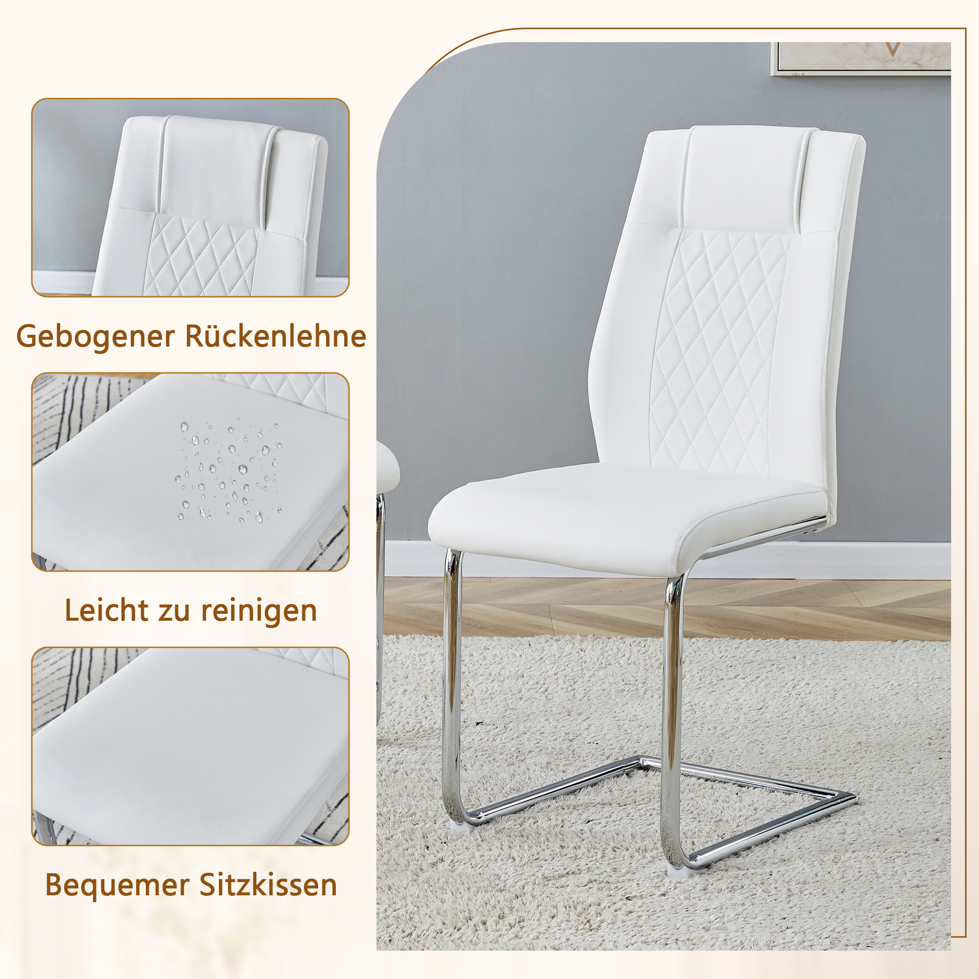 White PU leather combined with silver-colored, arched metal legs. This design is ideal for dining areas in Scandinavian, modern, or industrial styles and also lends a subtly luxurious feel to small apartments.