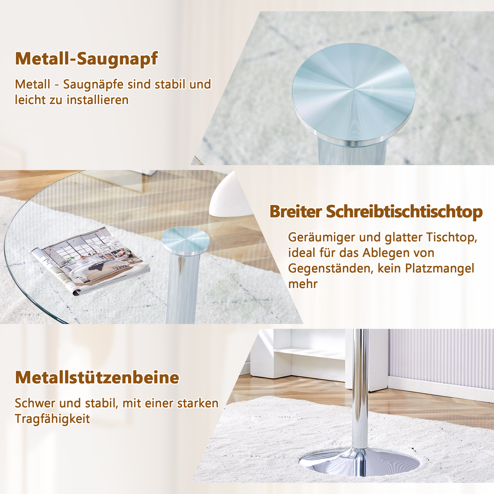 The tabletop has a total height of 76 cm and a diameter of 85 cm. This size is not only ergonomically designed for comfortable placement and use while seated, but it also does not take up too much space and is suitable for various room layouts.
