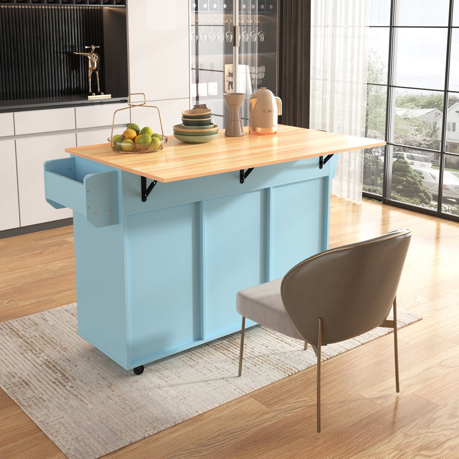 Dining Trolley Sideboard with Fold-Down Worktop and Casters, Blue and Solid Wood Grain