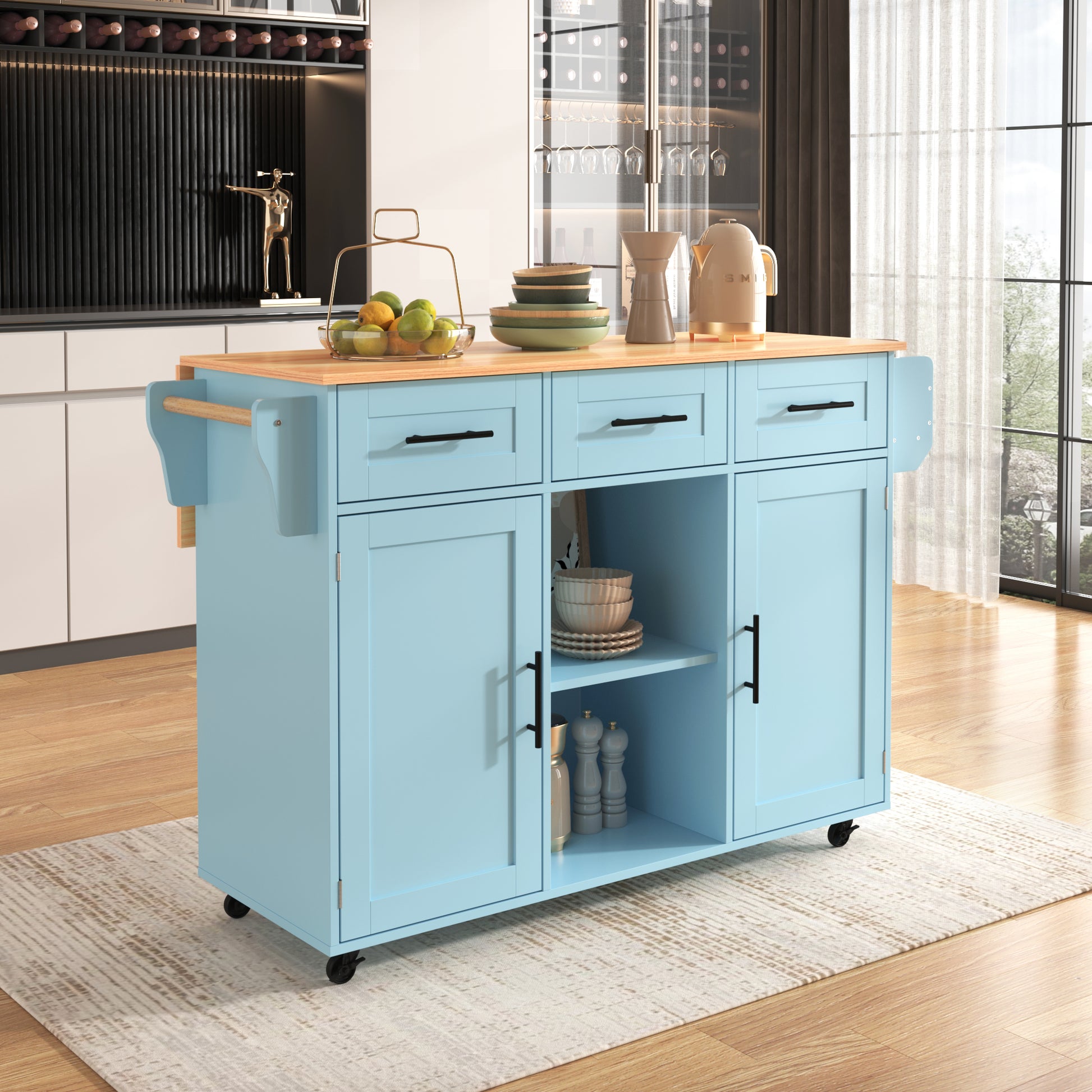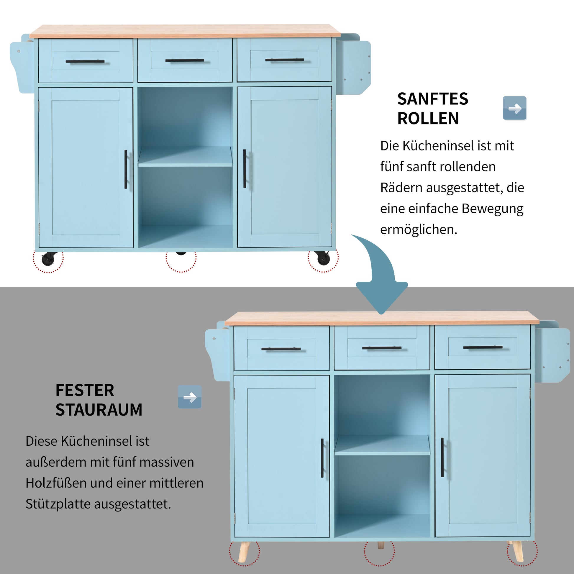 The kitchen island is equipped with five sturdy casters for easy movement. For a stationary setup, the casters can be replaced with five included solid wood legs and a central support, converting it into a fixed, 95 cm high sideboard. This extensive range of features caters to various usage scenarios and lifestyles.