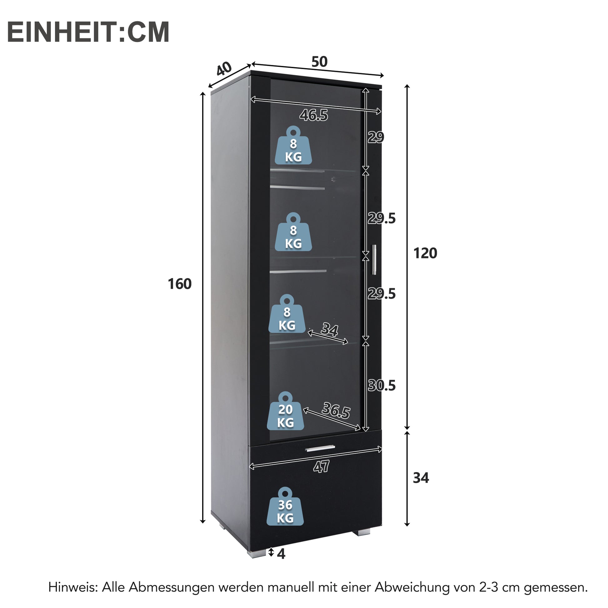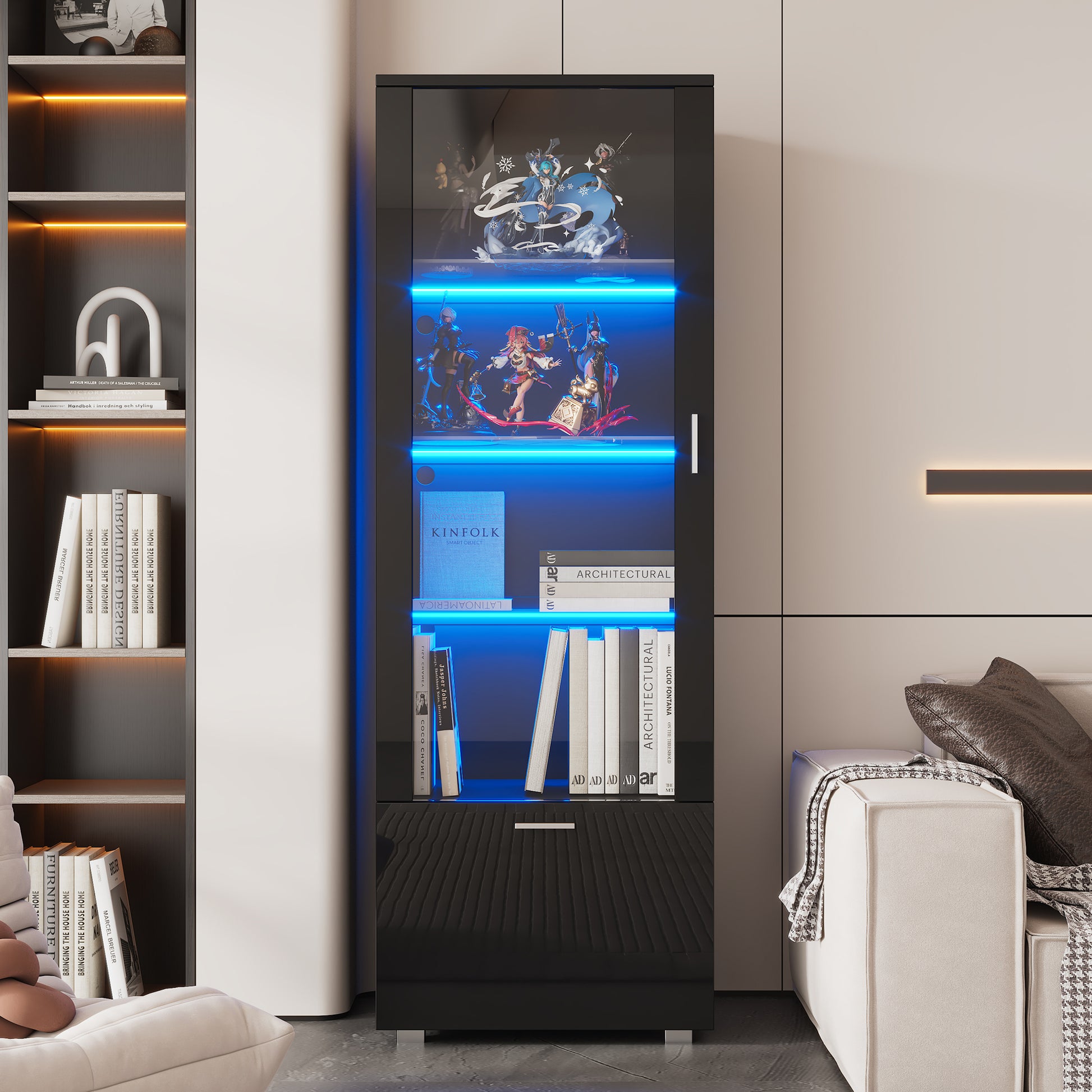 This modern black high-gloss display cabinet features an LED remote control with multi-adjustable lighting and dynamic modes. It has an acrylic glass outer door, tempered glass shelves, and a non-adjustable height. With its high-gloss laminate design and cool lighting, this black cabinet is perfect for living rooms, study rooms, and playrooms. It can be used to collect books or display your favorite items. Made from high-quality particleboard material with an anti-tip mechanism and door suction cups, this display cabinet is durable, safe, and easy to clean.