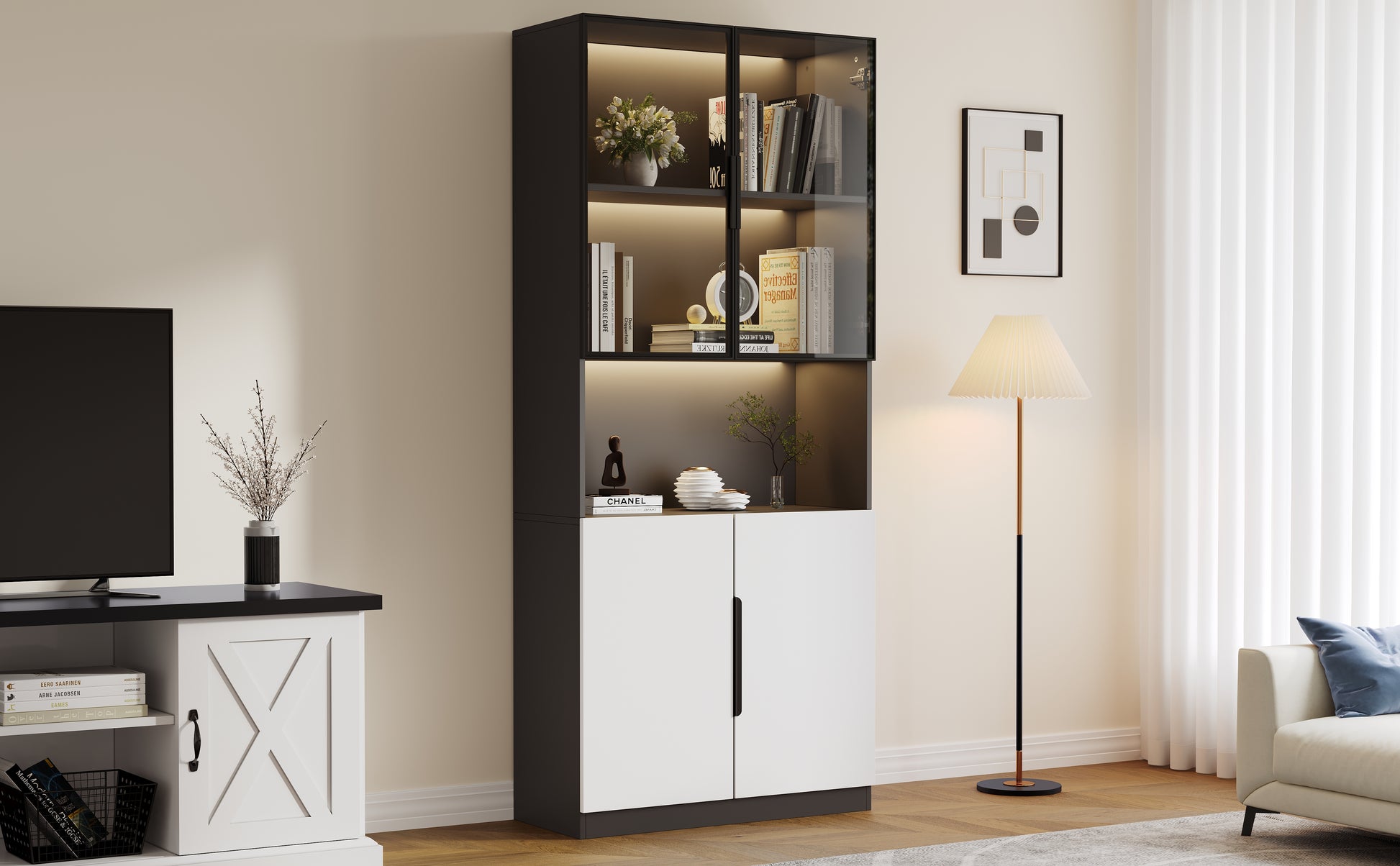 Display Cabinet, Minimalist LED Glass Doors, White with Black Decoration