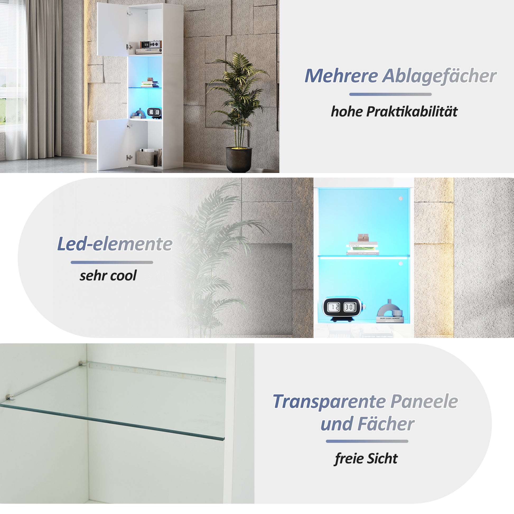 This white high-gloss cabinet features tempered glass dividers and LED strip lights, offering a sleek and distinctive modern design. With two generously sized storage compartments, it provides ample space for most storage needs. Please note: The high-gloss surfaces of both cabinet doors are protected by a film; remove this film after assembly to reveal the full brilliance of the cabinet. Constructed from high-quality particleboard and equipped with an anti-dumping device, this cabinet is both durable and safe.