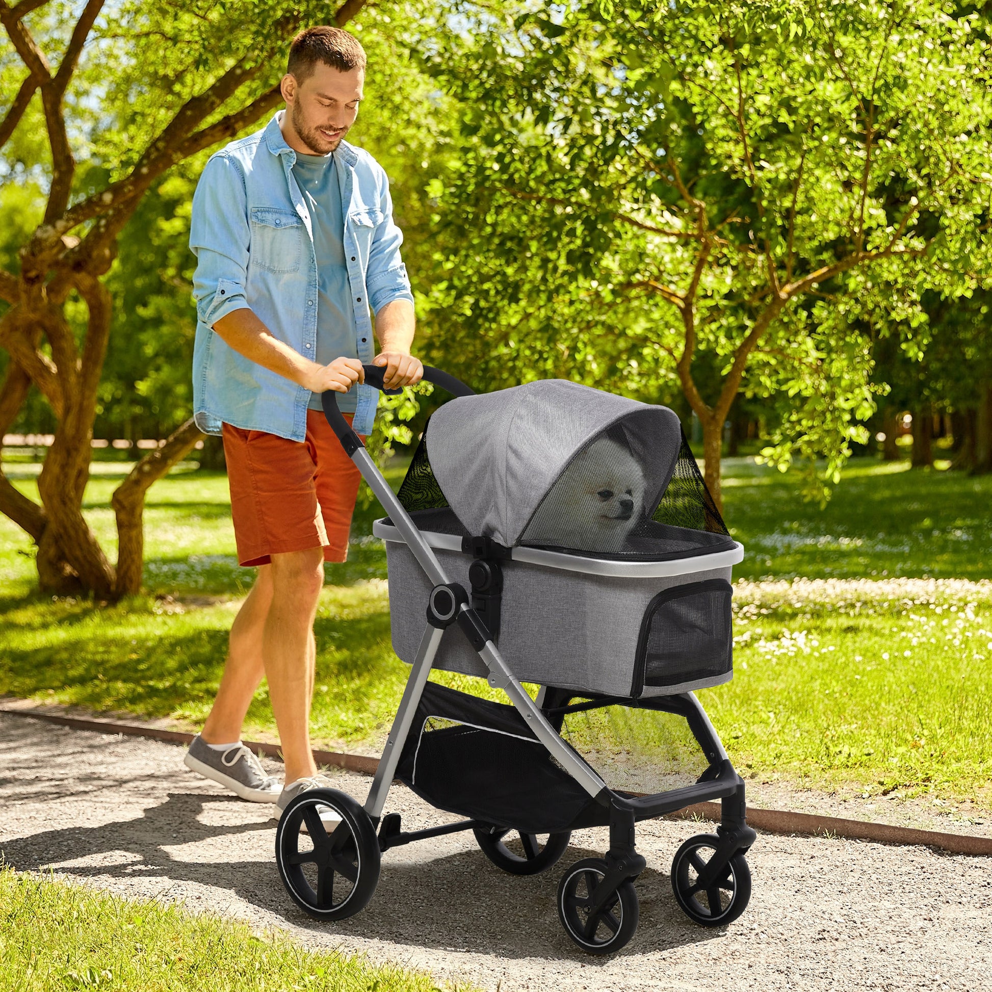 Dog Stroller 2-in-1 Foldable, Brakes, Mesh Window, Light Grey