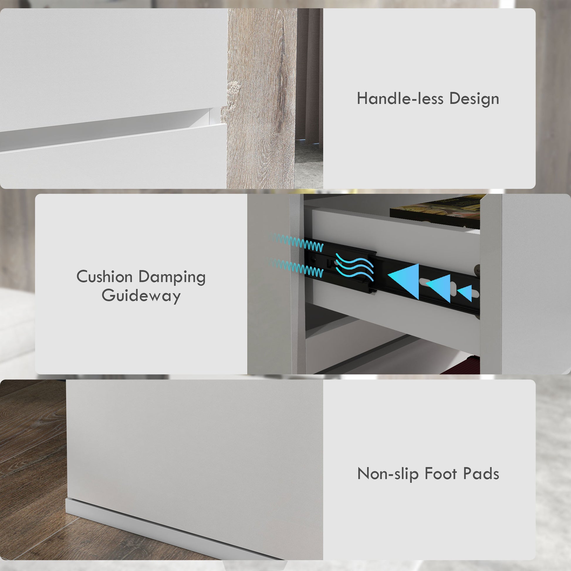 Five handless drawers and a flat table top offer plenty of storage for your bedroom and around the home. Cushioning rails are safe and noiseless, allowing the dresser to close automatically and slowly to prevent fingers from being pinched.