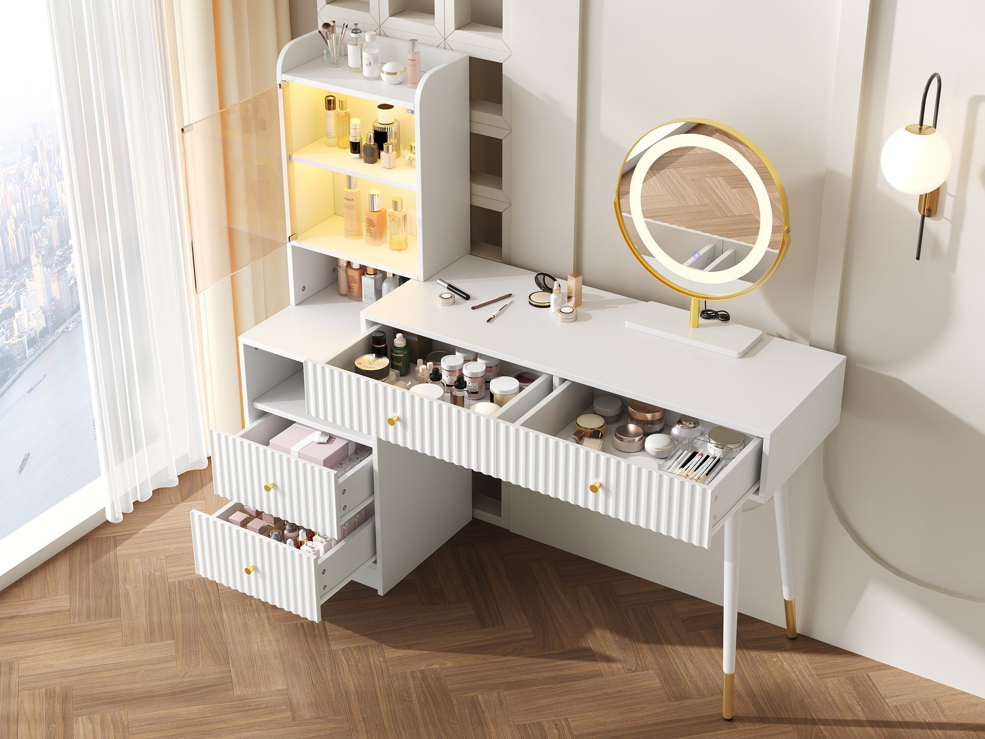 Dressing Table Set Tri-Color LED Mirror 4 Drawers Illuminated Cabinet White