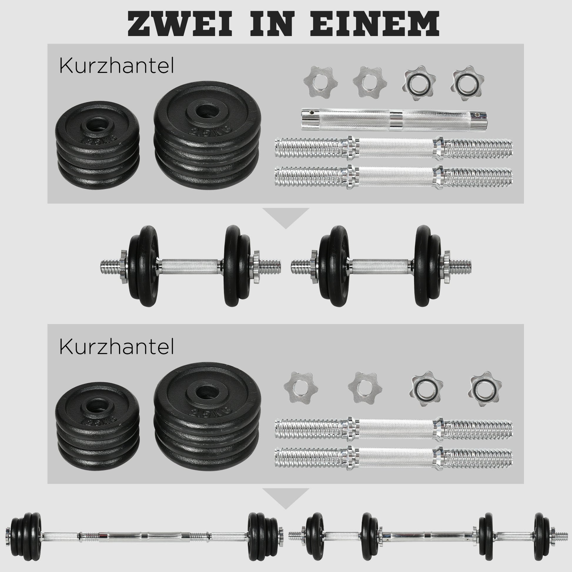 Barbell and Dumbbell in One: Train with two dumbbells or conveniently combine them to form a single barbell. The total weight is 20 kg. Included are four 2.5 kg weight plates, four 1.25 kg plates, two dumbbell handles, and a connecting bar. Combine the weights and dumbbell lengths to your liking to make your workout particularly versatile and effective.