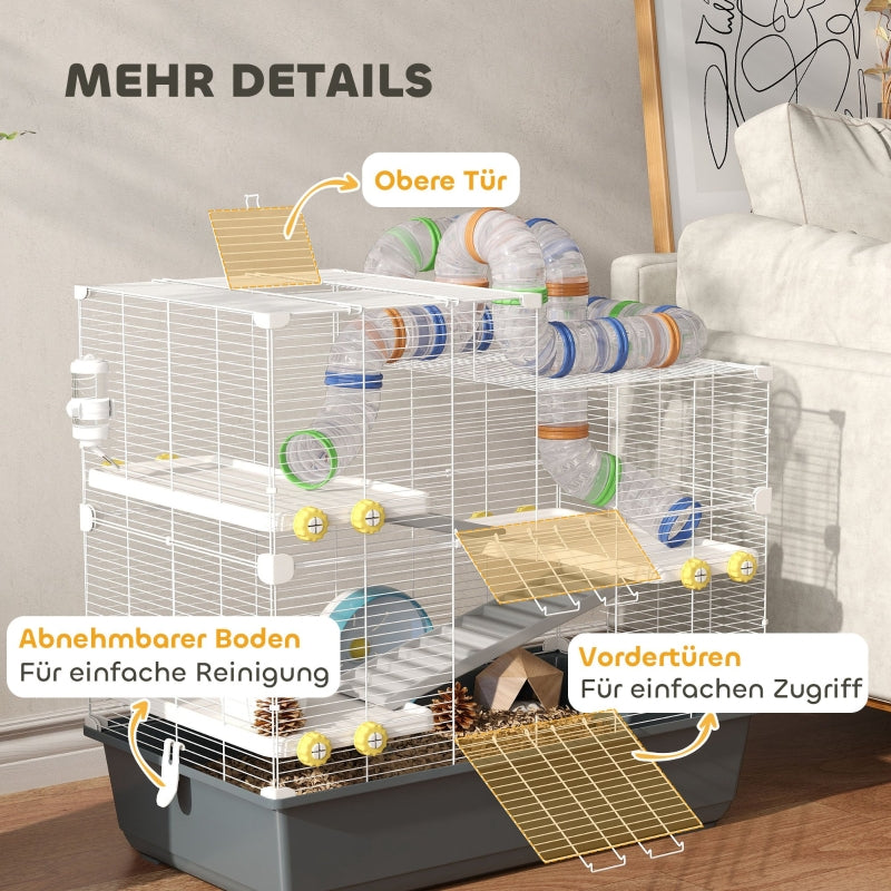 Complete accessory set: This small animal cage comes with 3 perches, 3 ramps, a cozy hut, a running wheel, a water bottle, and a food bowl, complemented by a 14-piece tunnel system.