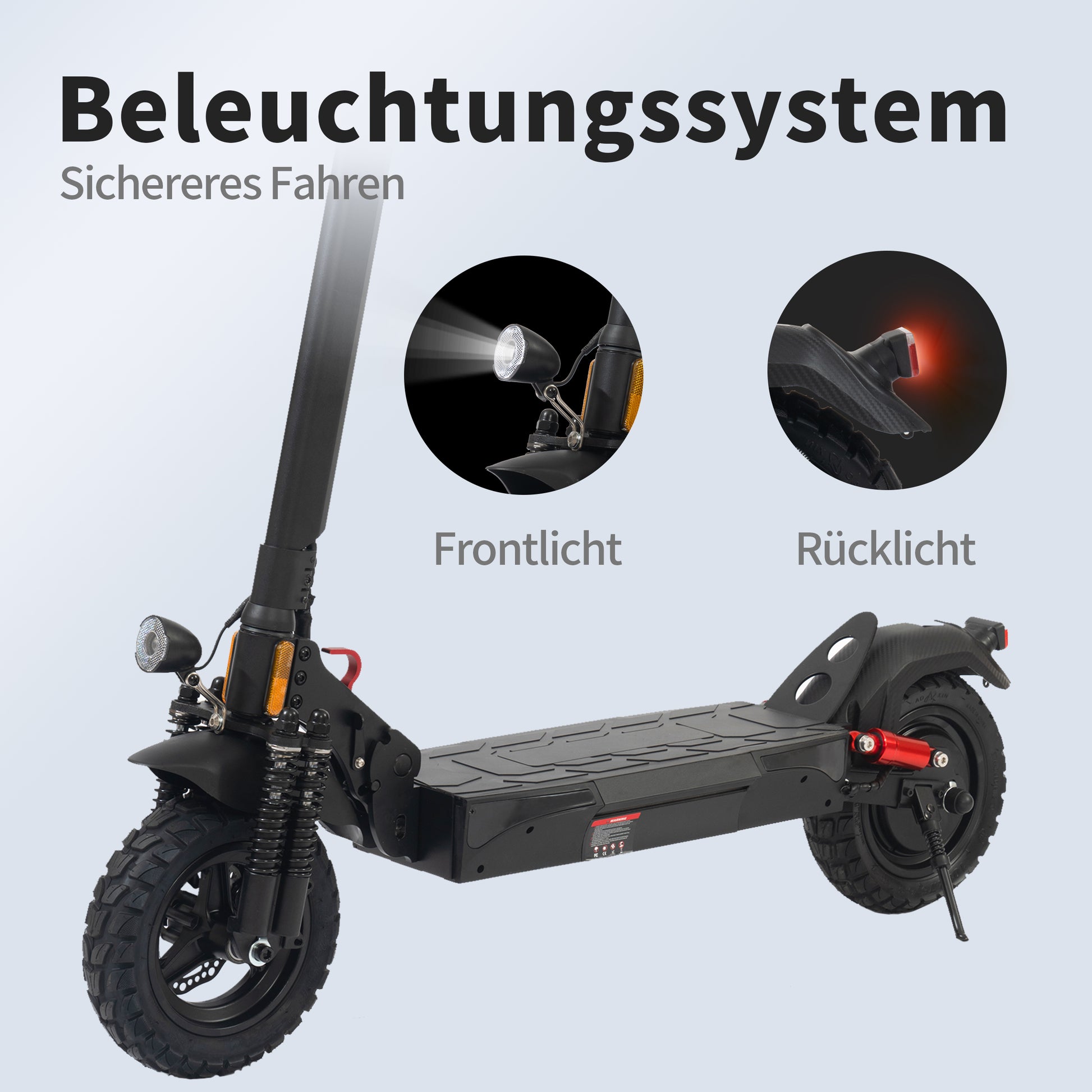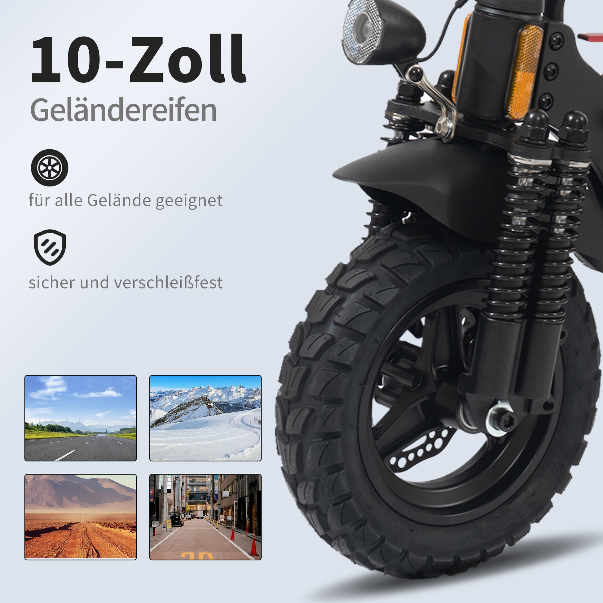 10-inch All-Terrain Tires & Dual Shock Absorption: The large, non-slip 10-inch off-road tires offer excellent grip and stability on a variety of surfaces. Additionally, front and rear shock absorbers ensure a smooth, comfortable ride – even on uneven roads or cobblestones.
