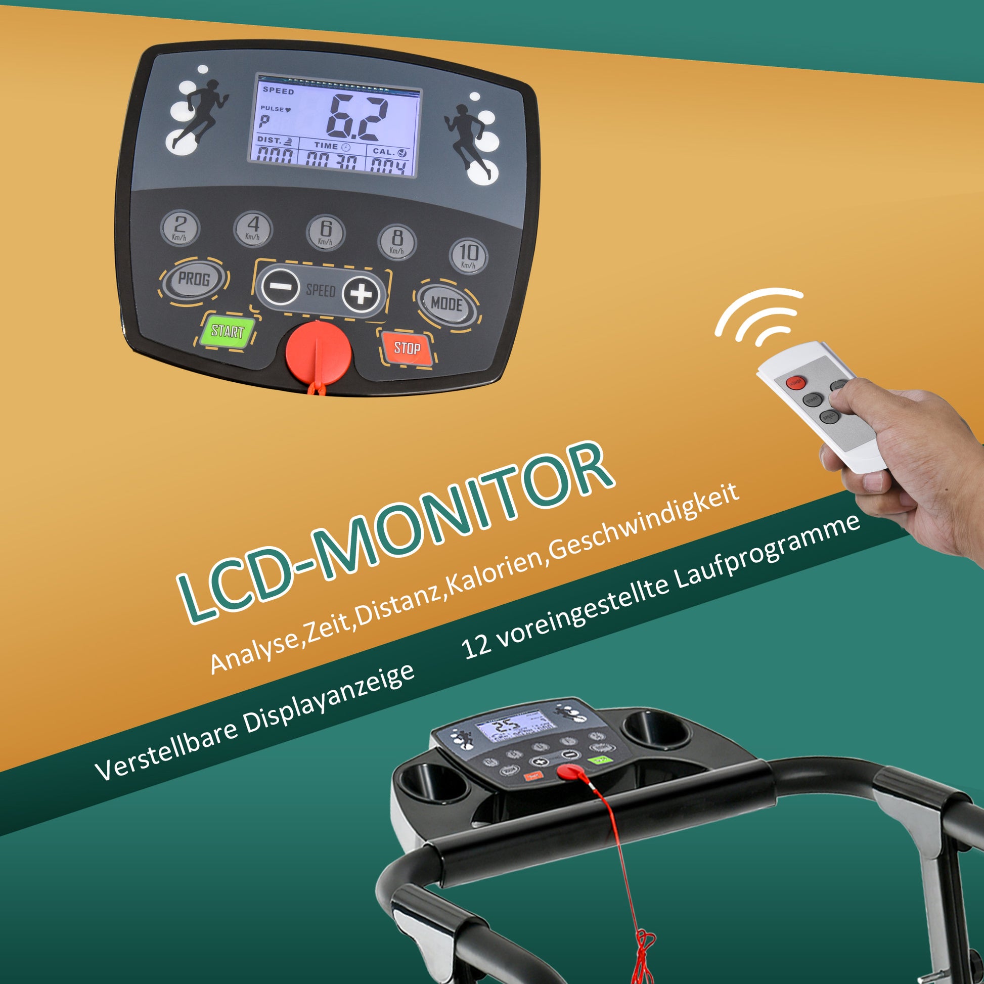 LCD Monitor Display: The LCD monitor displays time, distance, calories, and speed. It also features a safety button to stop the treadmill immediately in an emergency.