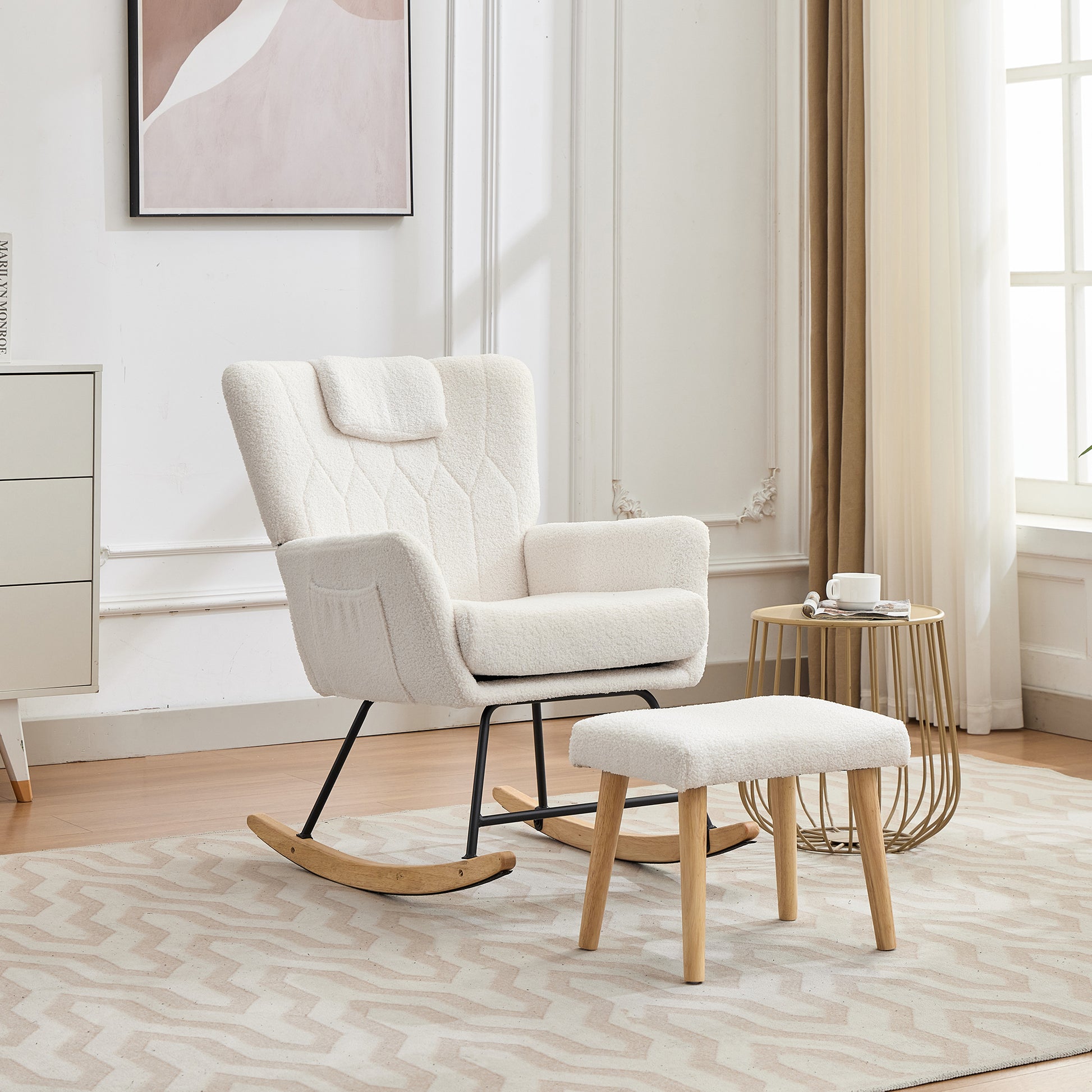 Ergonomic Rocking Chair with Footstool, High Backrest, 30-degree Rock, White Rubberwood
