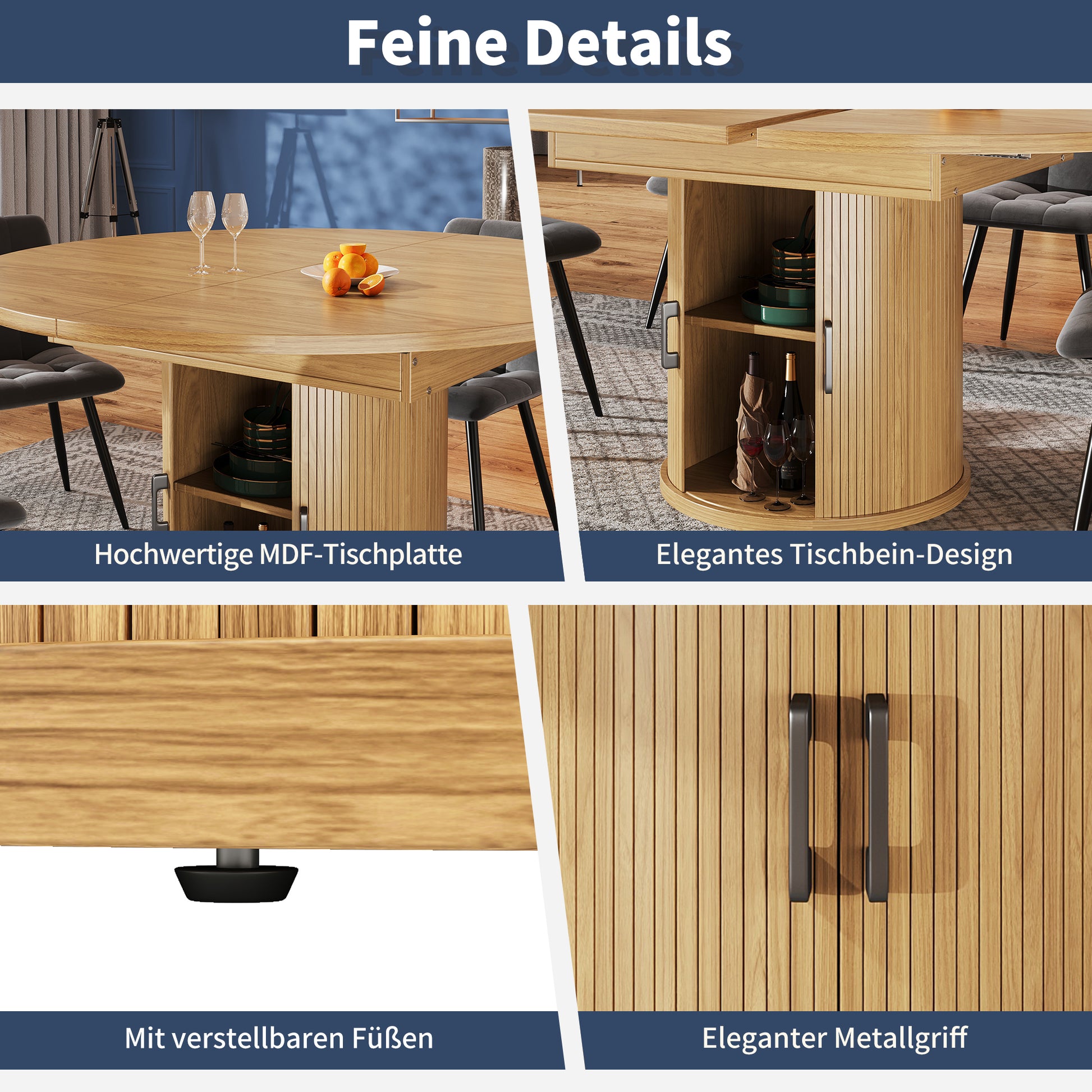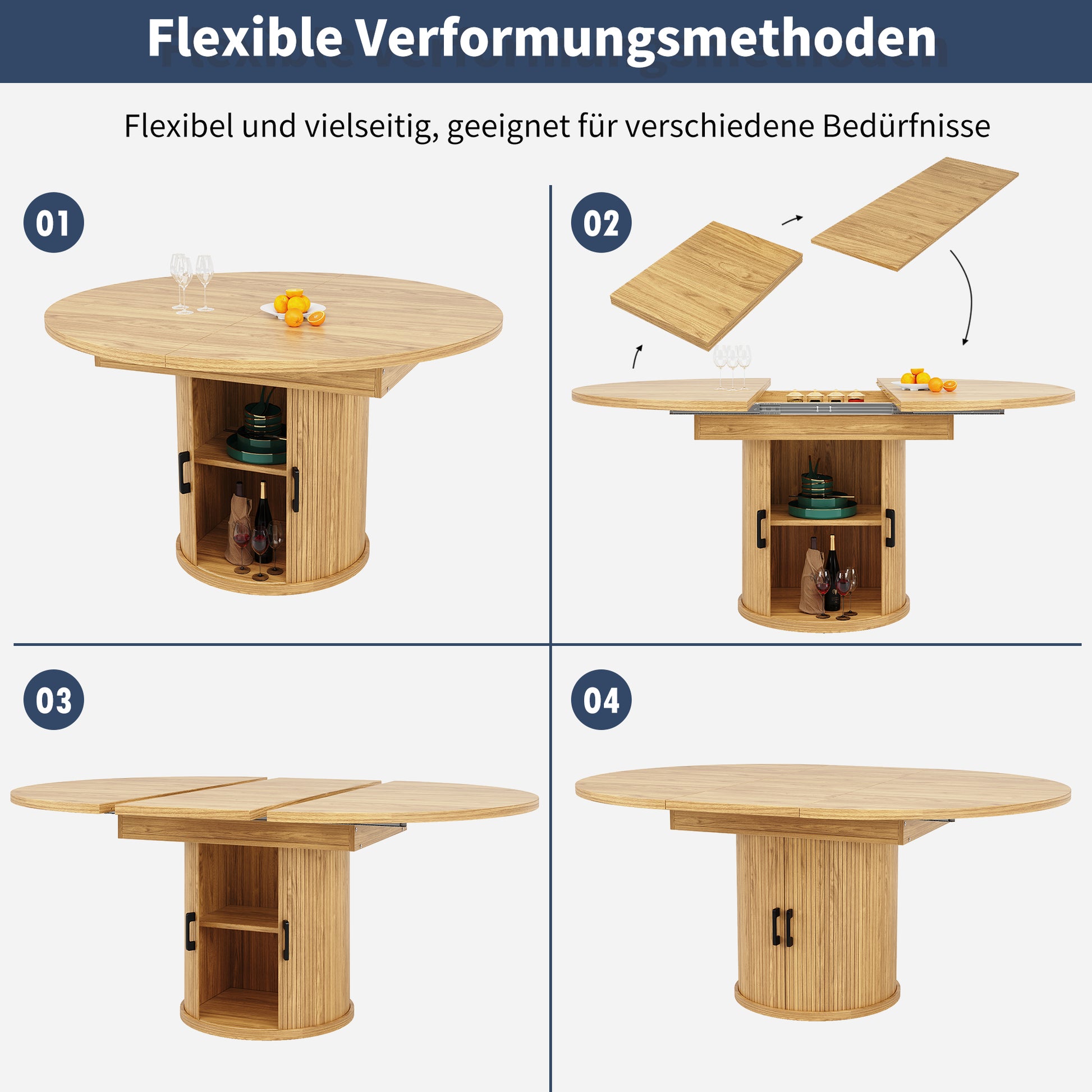 The tabletop is easily extendable from 118 cm in diameter to 158 cm in length via a sliding rail underneath. When not in use, the extended worktop can be conveniently stored in a hidden compartment beneath the tabletop. For stability on various surfaces, the unit is equipped with six adjustable legs, allowing it to be placed in the kitchen, dining room, on a balcony, patio, and other locations.