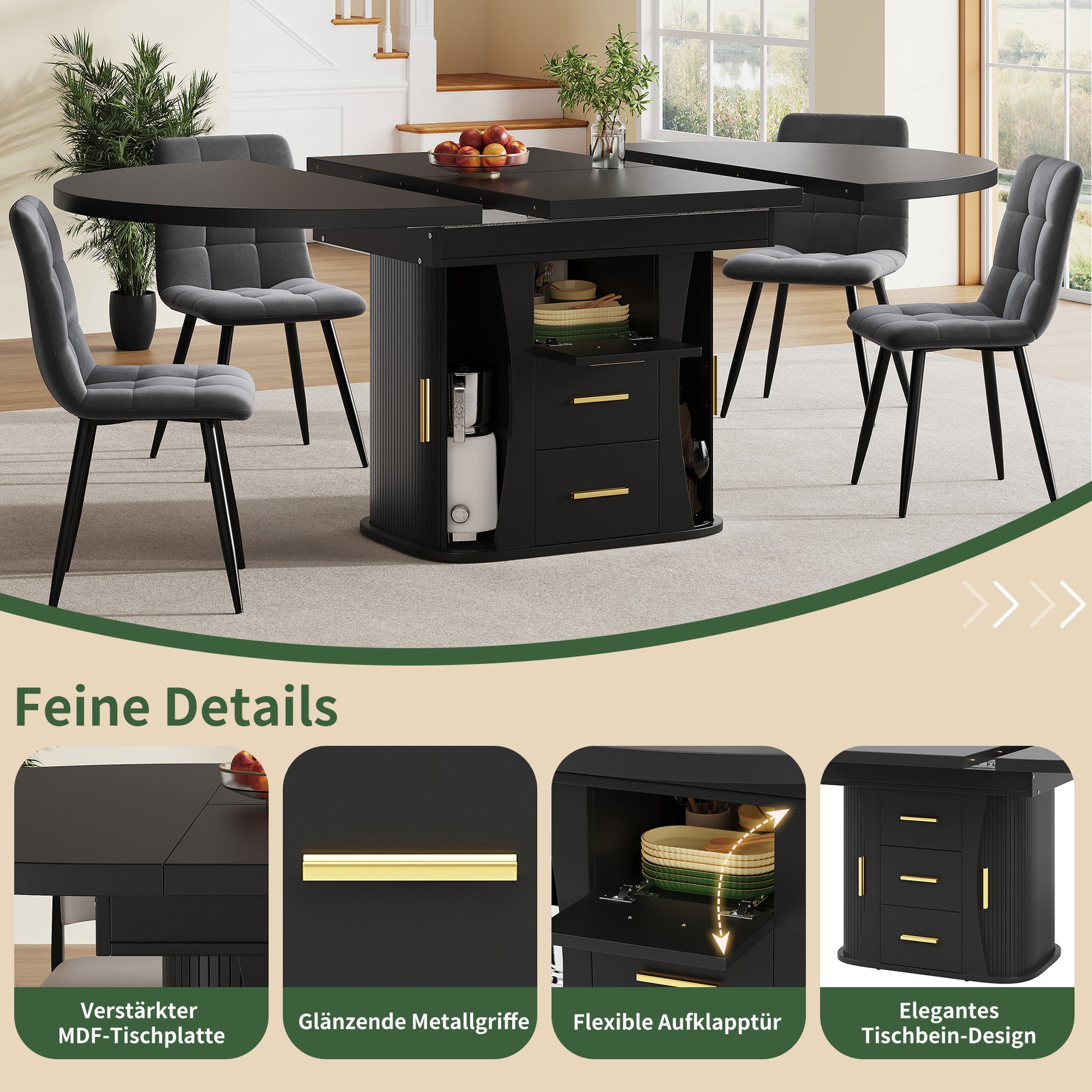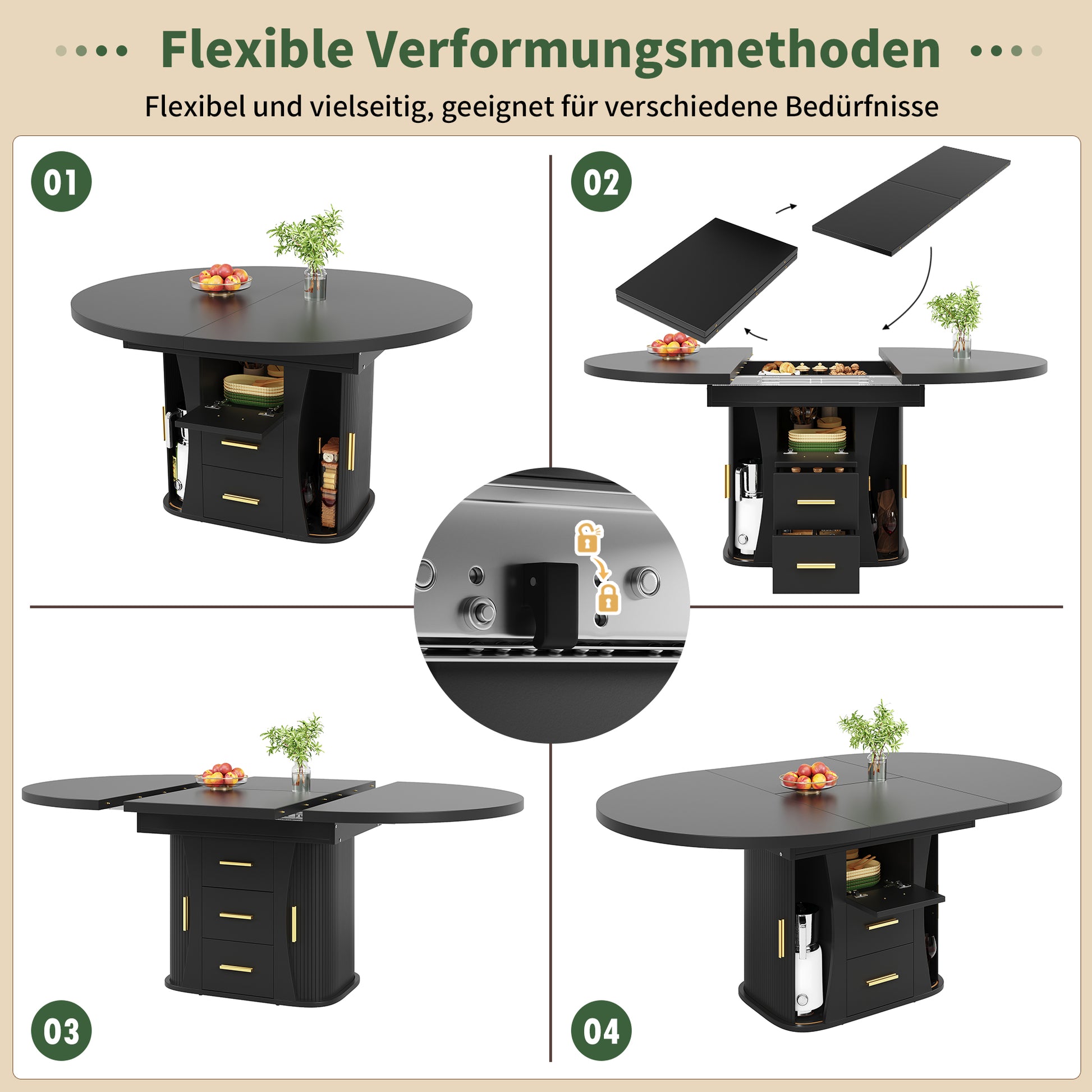 Extendable Round Dining Table, Seats 6 People with Three-tier Storage, Black