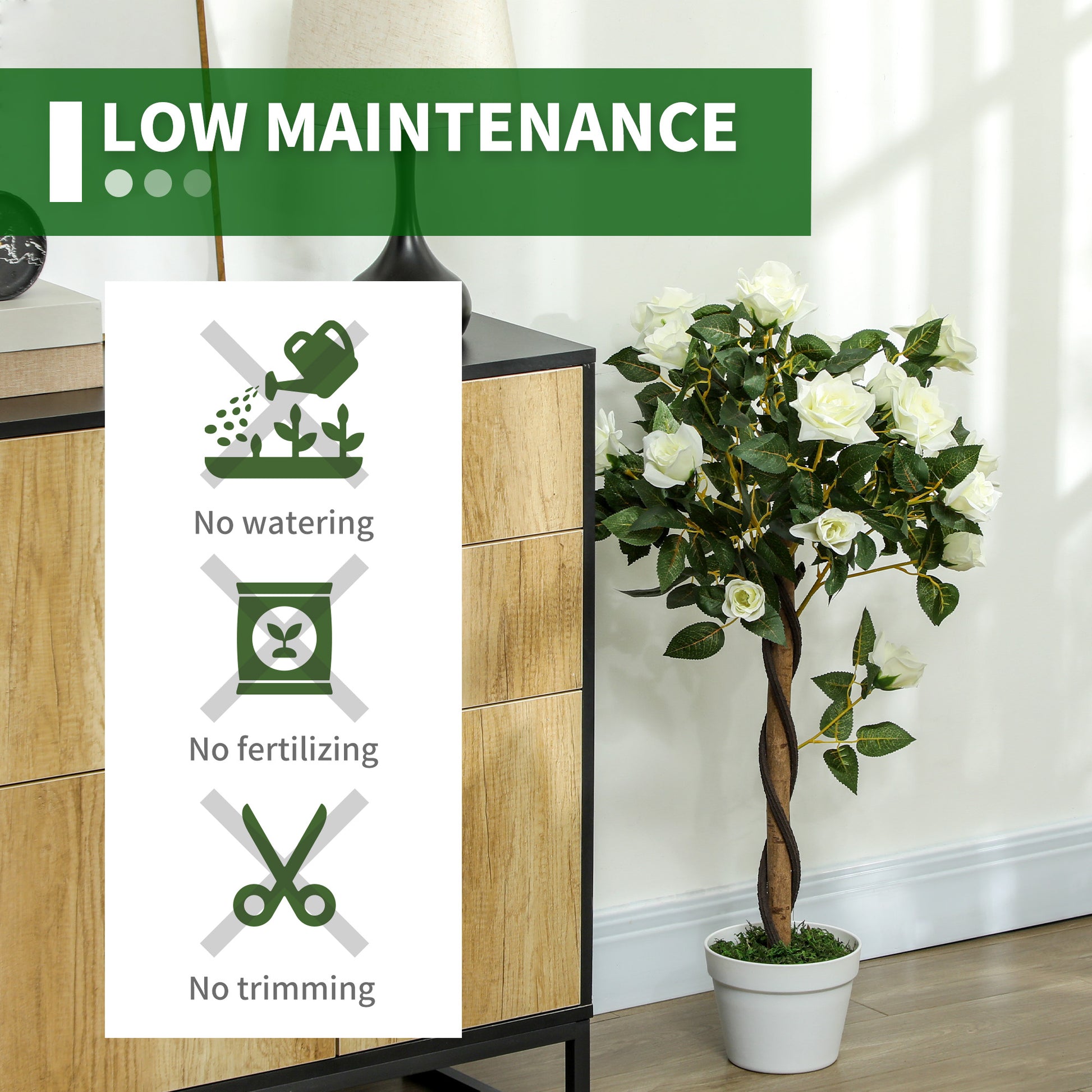Easy to maintain: No need to water to keep alive and healthy, the fake plant will look great all year round. Can be wiped clean with a damp cloth.