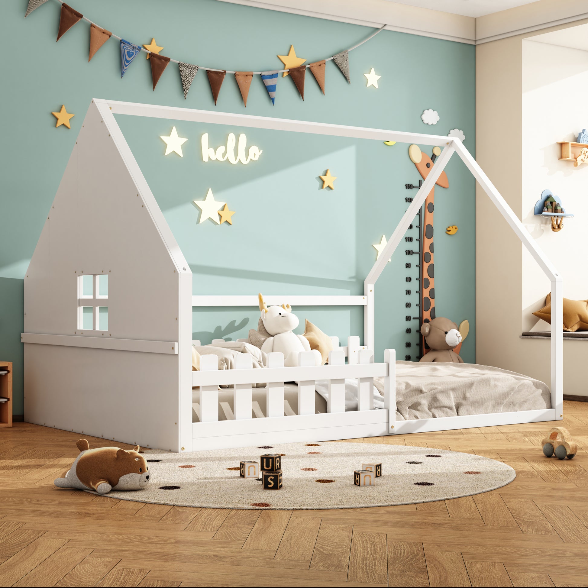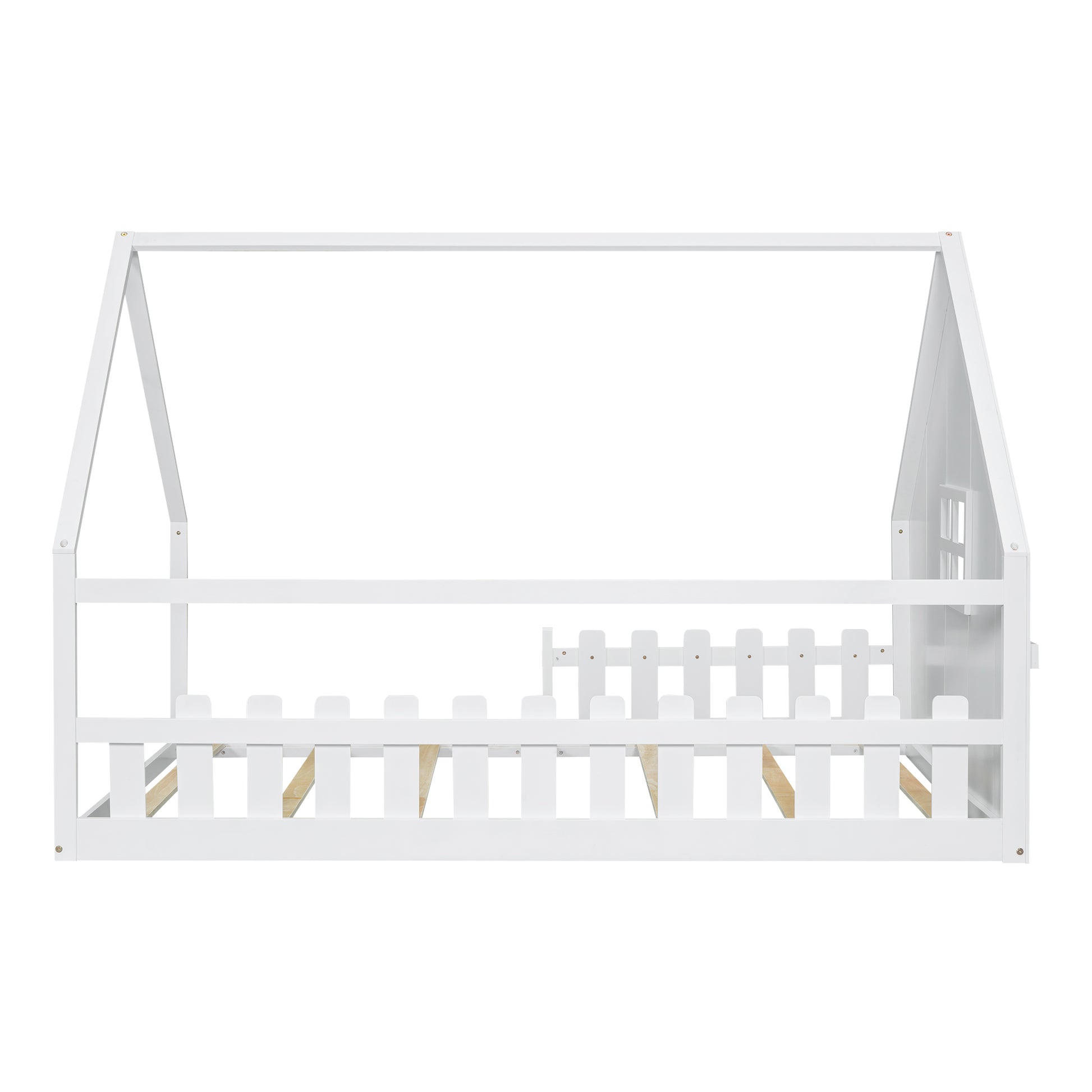Flatbed Children's Bed with House Rail & Railing, 140x200cm Pine Wood White