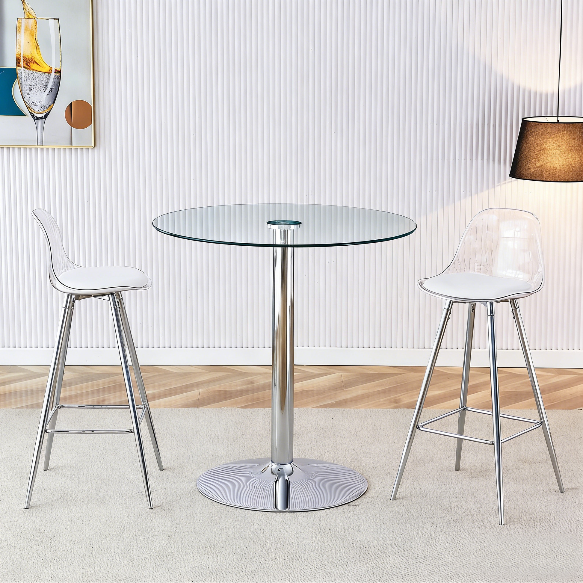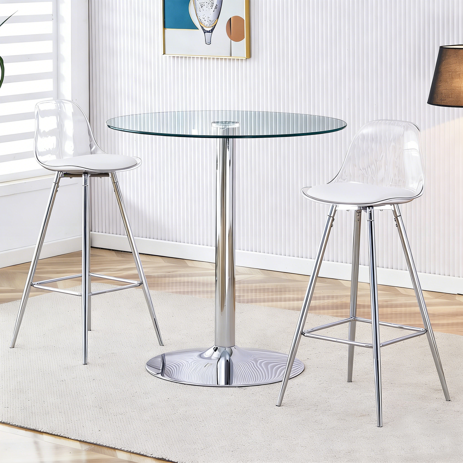 This modern round glass table with two matching bar stools featuring transparent backrests is the ideal choice for your home. It is not only suitable for private dining areas but also perfect for bars, cafes, or office lounges. The transparent material and contemporary design blend harmoniously with various interior styles while offering comfortable use.