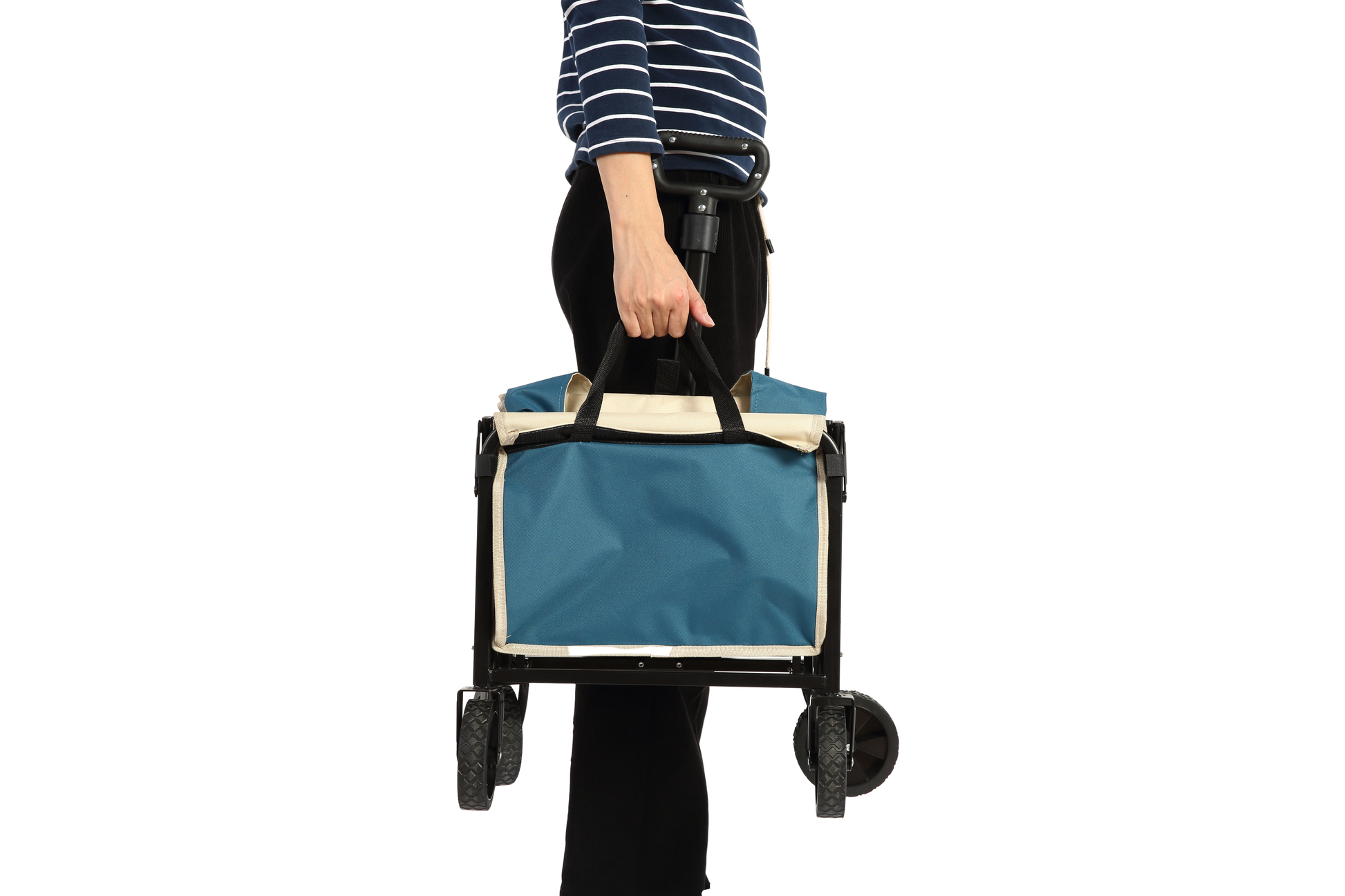 The frame of the folding cart is made of high quality steel for reliability and durability. Capable of carrying camping gear, garden gardening items, sundries and other items. And it can free up space on both sides for pulling longer and wider loads.
