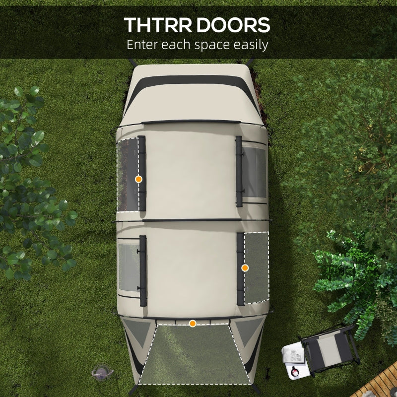 This family tent is designed for four people and features a two-room layout, offering ample space to sleep, relax, and store belongings. It includes a dedicated bedroom and a separate living area for comfort and convenience.
