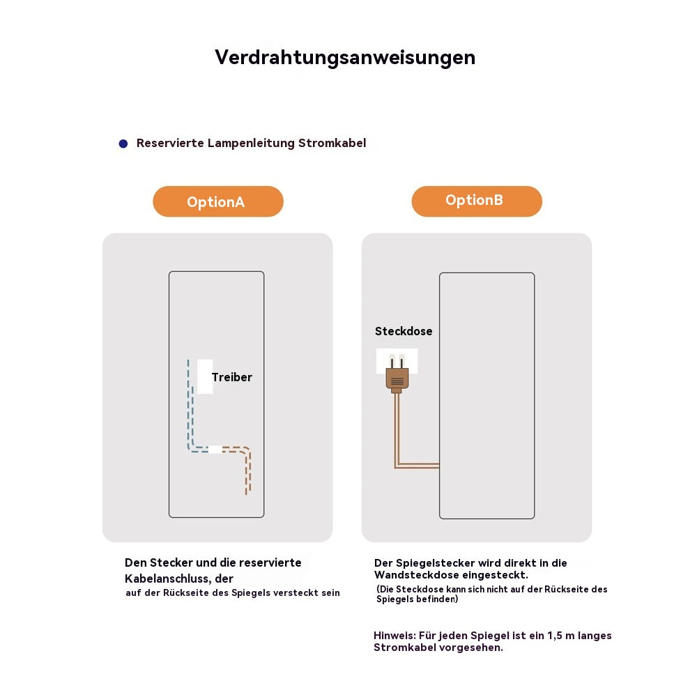 2. Direct connection to a wall outlet (the outlet must be located outside the mirror).A 1.5-meter power cord is included as standard, and the driver is housed in a waterproof box. All wiring is concealed on the back. This eliminates cluttered cables and ensures both aesthetics and electrical safety.