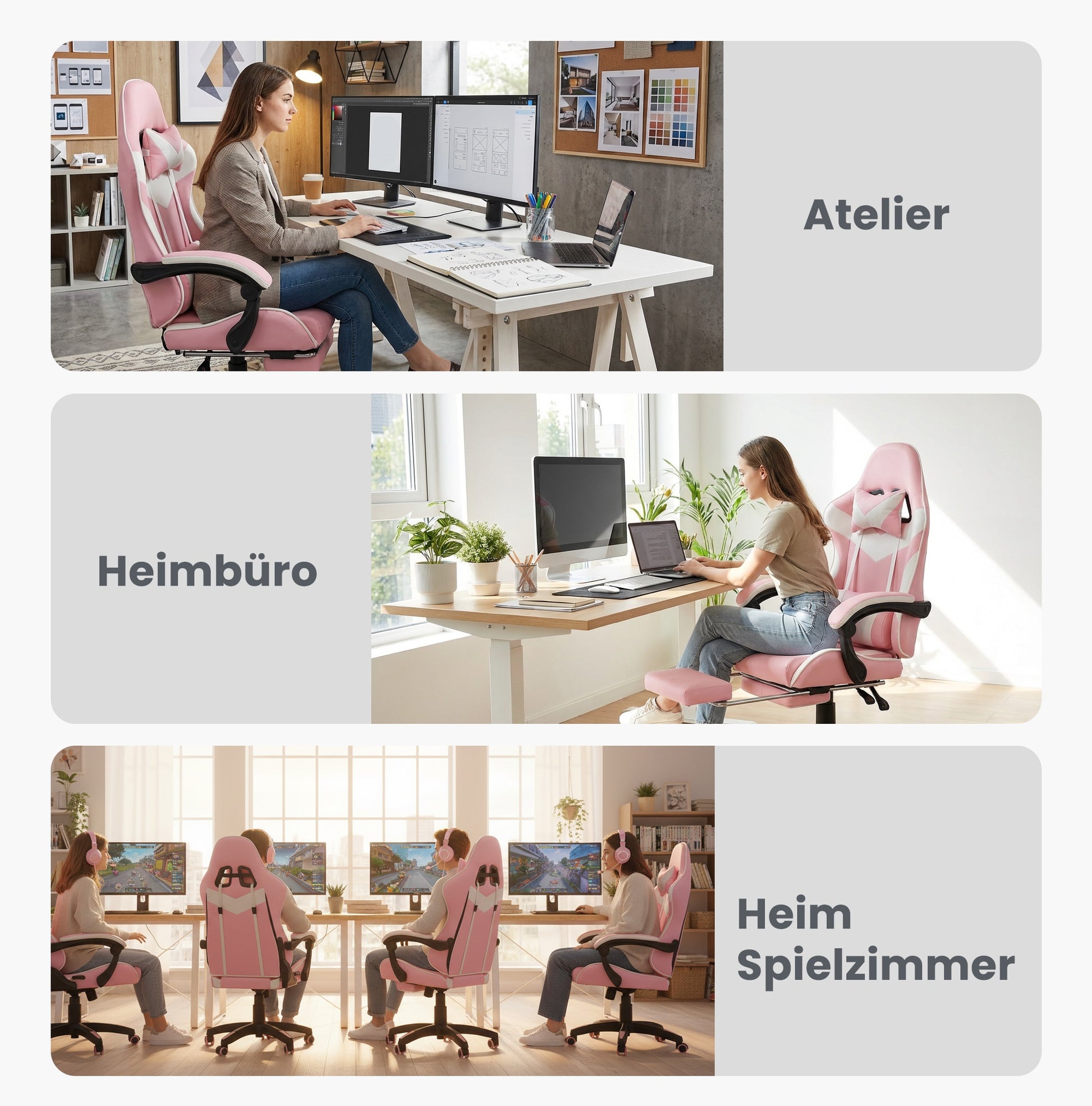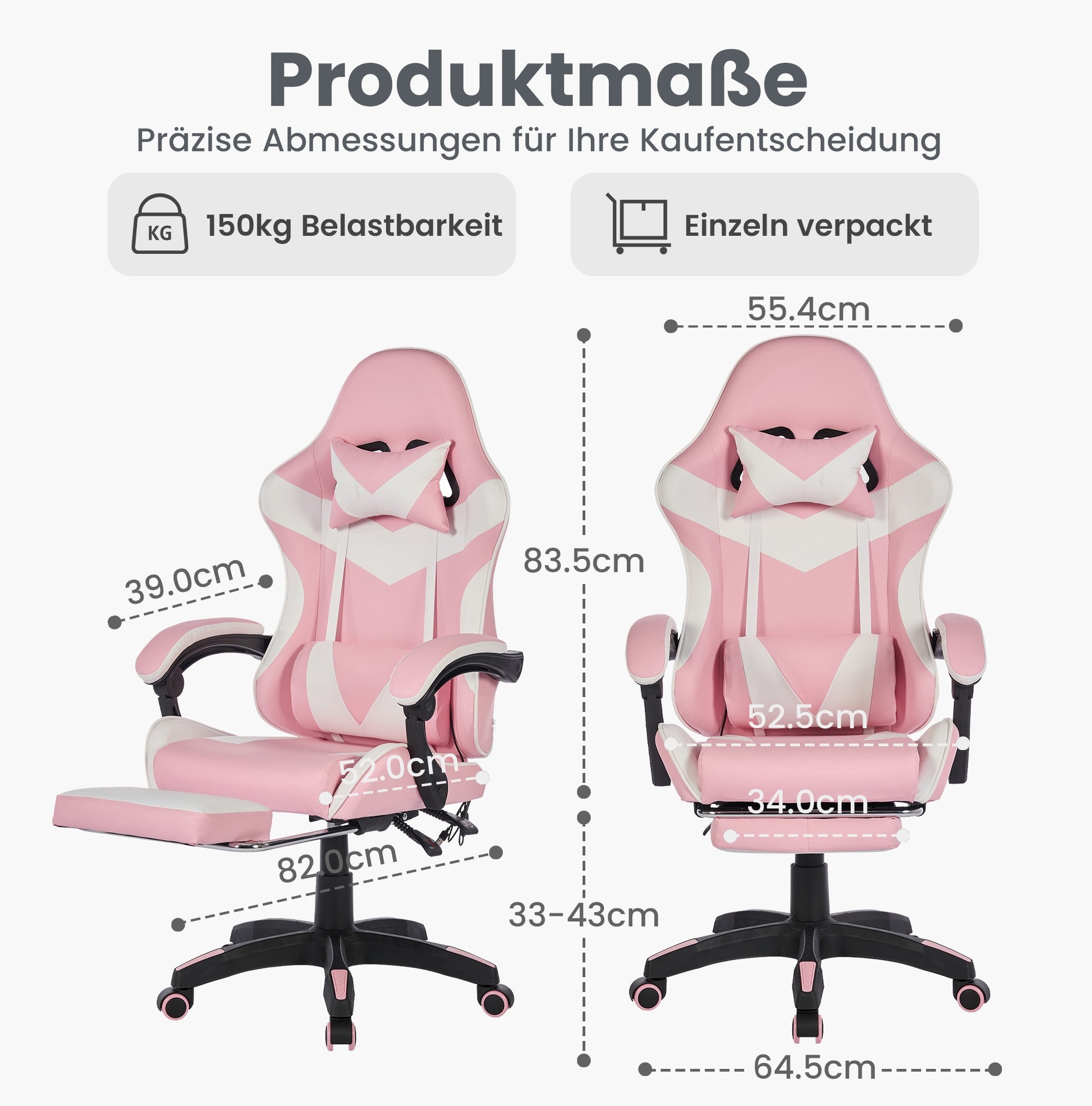 Gaming Chair 360° Swivel Ergonomic Racing High-Back Adjustable with Footrest and Lumbar Support – White & Pink Leather