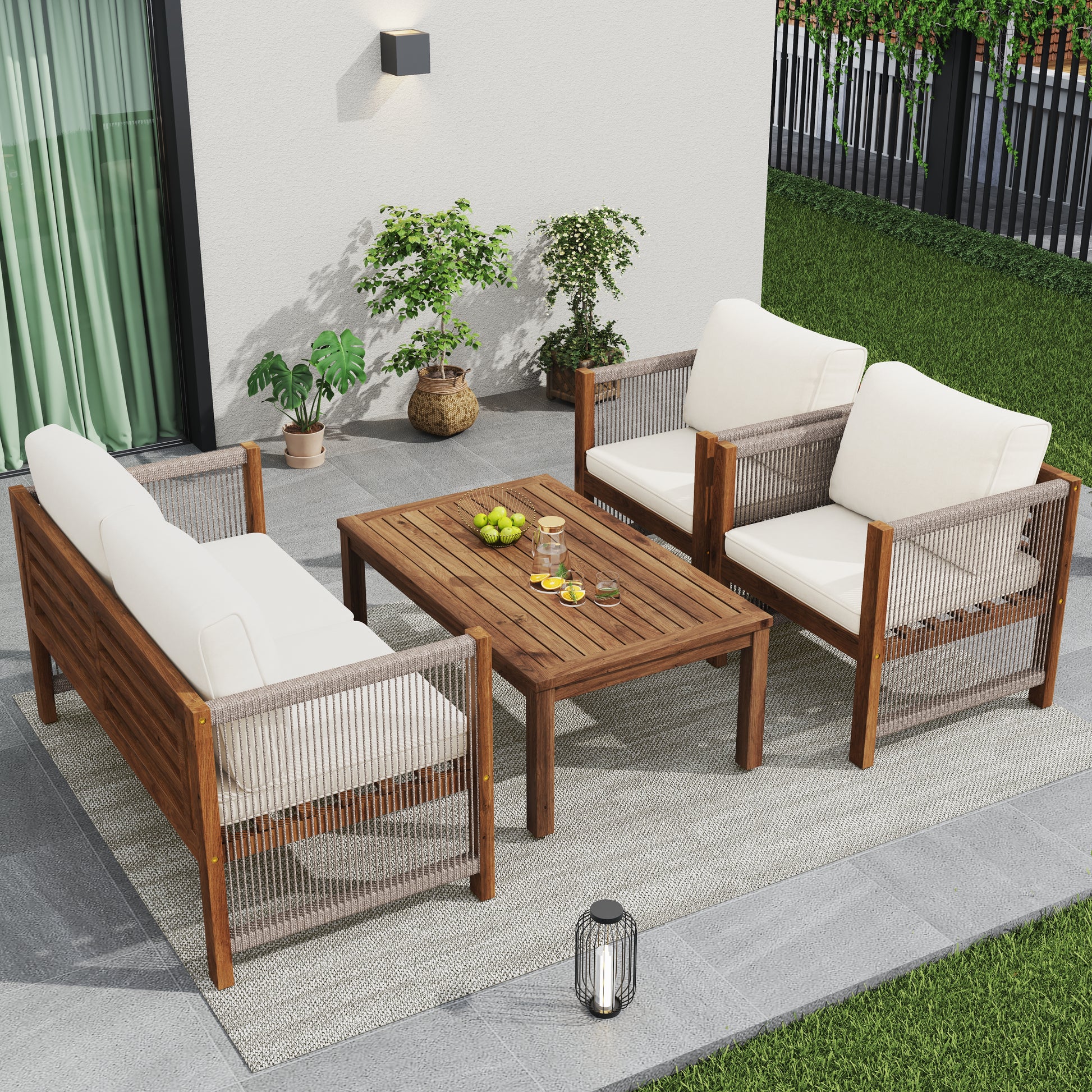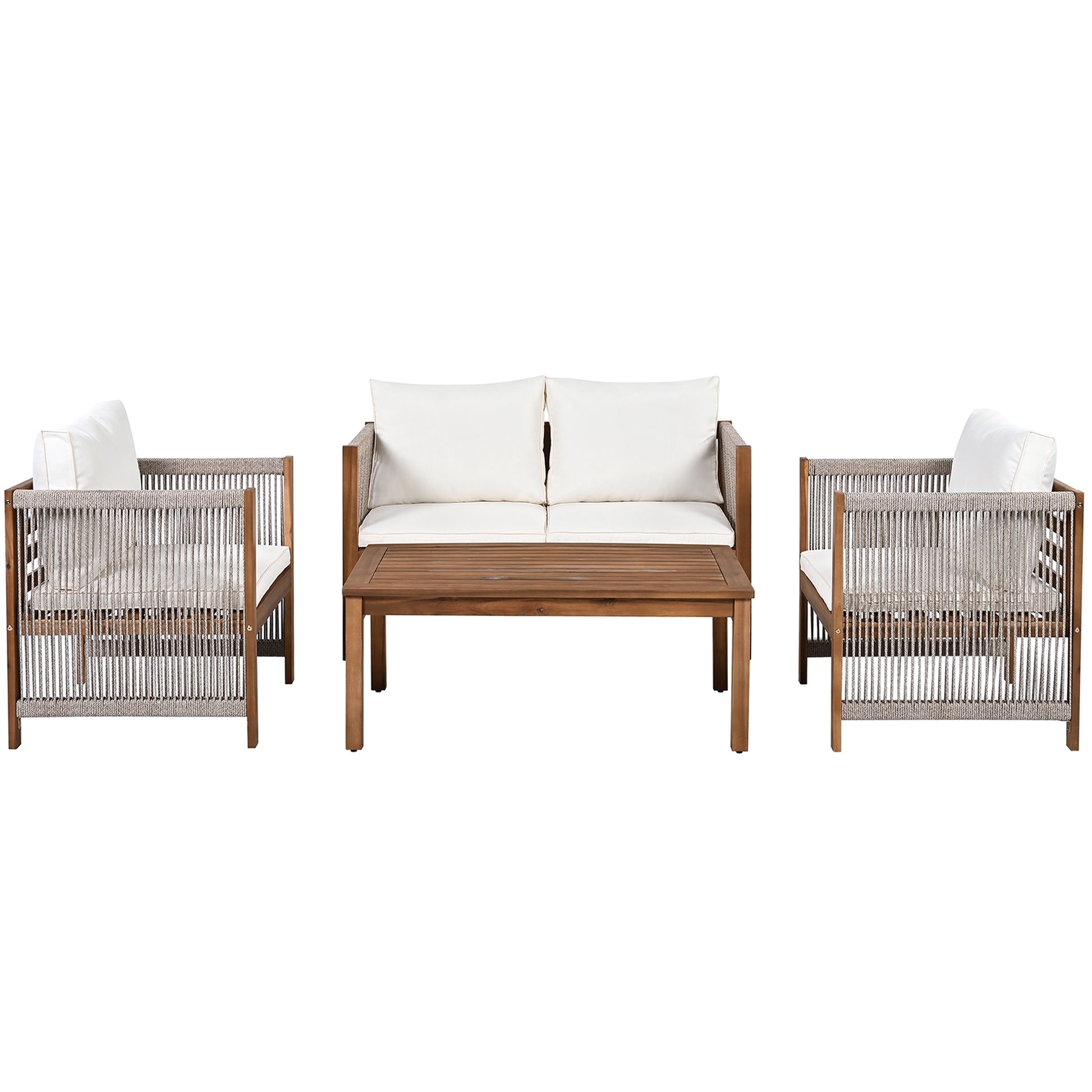Garden Furniture Lounge Set with Double Sofa 2 Armchairs and Table, Acacia and Beige Rattan Look