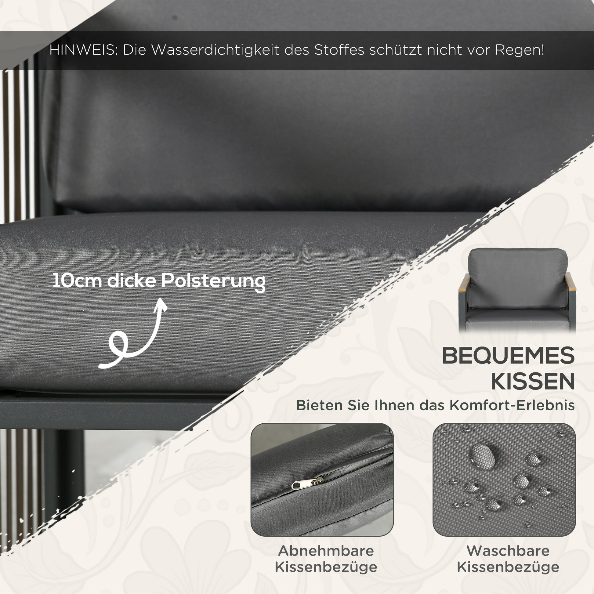 Comfortable seating: The chair armrests feature a wood-effect plastic cover. Thick seat and back cushions provide a soft and stable seating experience. All cushion covers are zippered, easily removable, and washable.