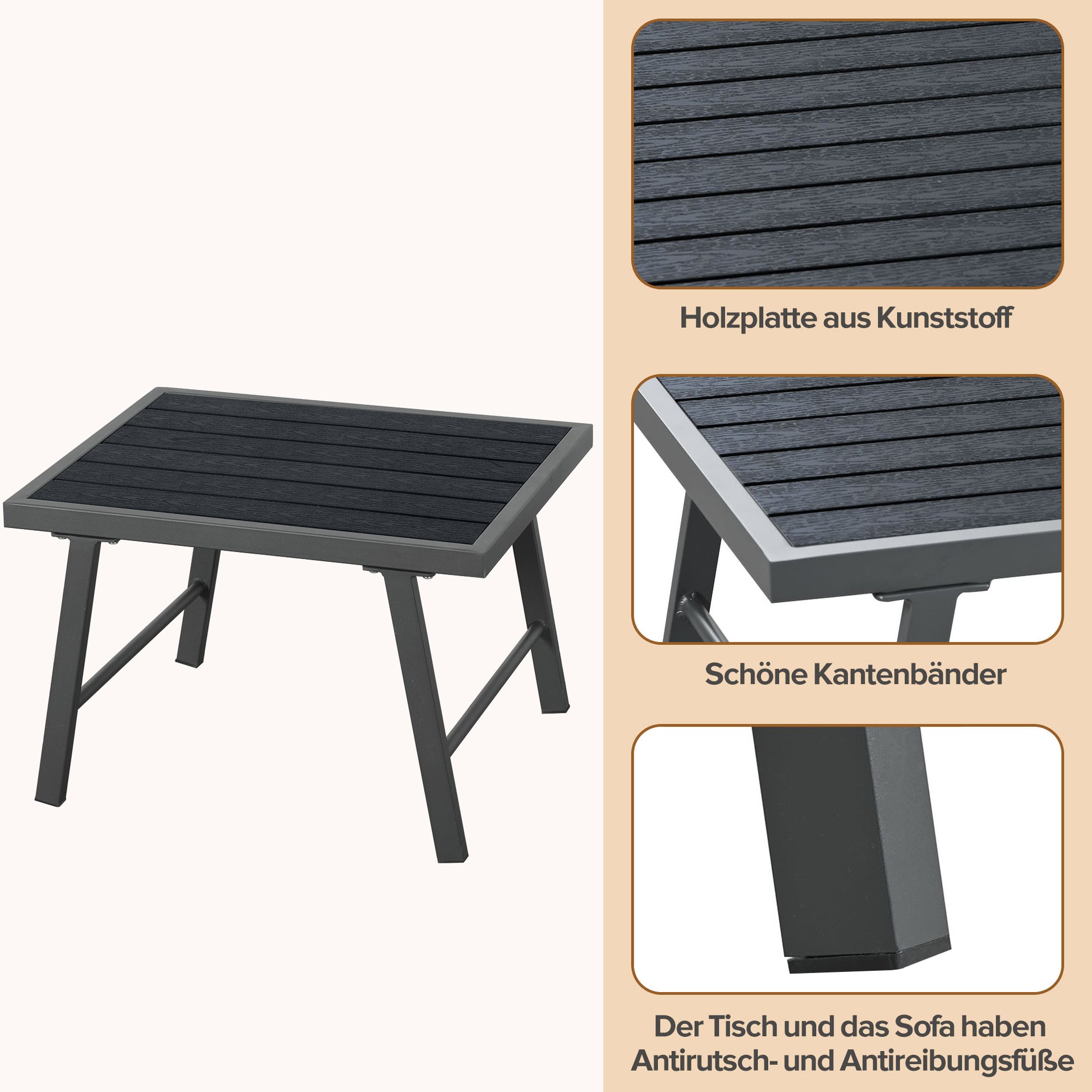 The plastic-wood tabletop is easy to clean and extremely durable. The galvanized iron frame structure is stable and corrosion-resistant. The zinc coating can effectively insulate the iron from moisture, oxygen, etc. in the air, significantly improving the corrosion resistance of the structure. Even in outdoor environments such as rain and humidity, it can remain in good condition for a long time, extending the service life of the sofa. It features adjustable feet that adapt to different floor surfaces to prevent wobbling. The sturdy backrest and solid metal legs provide this product with high-quality protection. The edge of the tabletop is finished with a beautiful edge band for added beauty and durability. The table legs are equipped with anti-slip and anti-friction features to ensure stability and safety during use.