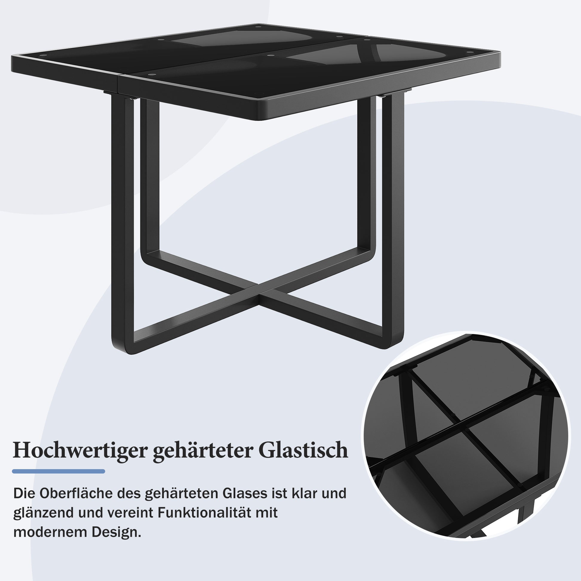 The tabletop is made of high-quality, tempered safety glass. It is clear, scratch-resistant, impact-resistant, easy to clean, and fully weather-resistant. The frame is constructed from rust-resistant materials with a reinforced build, supporting heavy loads and resisting warping and fading. Specifically designed for permanent outdoor use, this garden tableware set impresses with its durability and will reliably accompany you through many enjoyable outdoor moments, from everyday use to weekend barbecues.