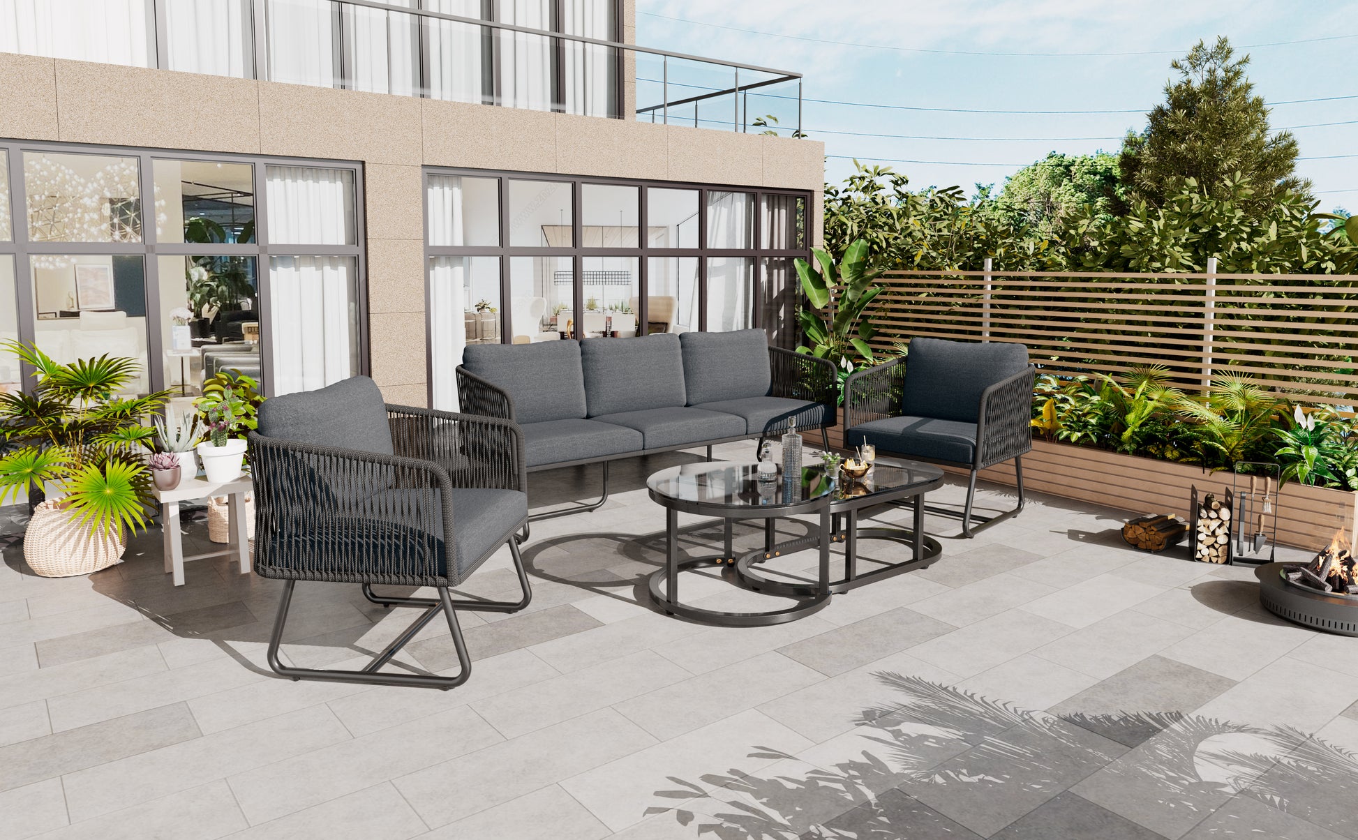 Modern Garden Furniture Set: This garden furniture set includes an attractive three-seater sofa, two oversized single sofas, and two practical coffee tables. With its modern aesthetic and retro charm, your comfort is paramount, featuring a high, ergonomic backrest and a deep seat that promotes proper posture and relaxation.