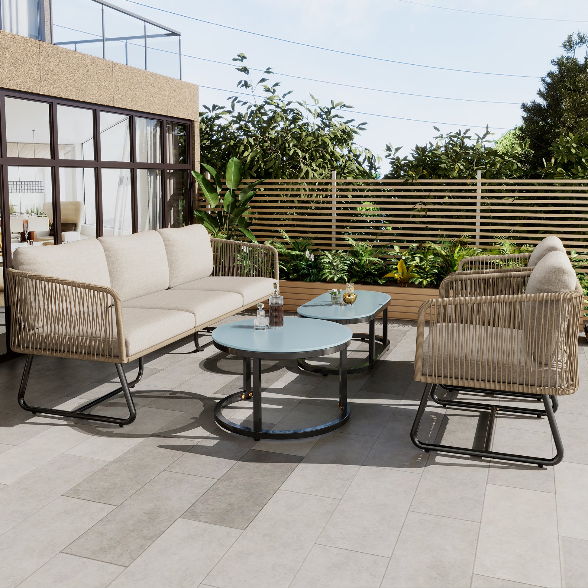 Garden Lounge Set 5-Piece Rope Galvanized Iron Frame Glass Tabletop - Beige