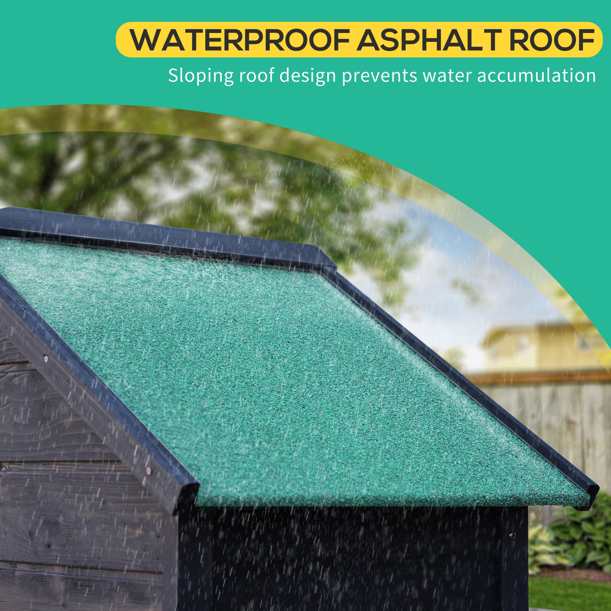 Fir wood structure, with asphalt roof: A strong structure, with a weather-resistant paint coating - suitable for outdoor use. Sloped roof to prevent water build up, with a covering to help stop liquids seeping through.