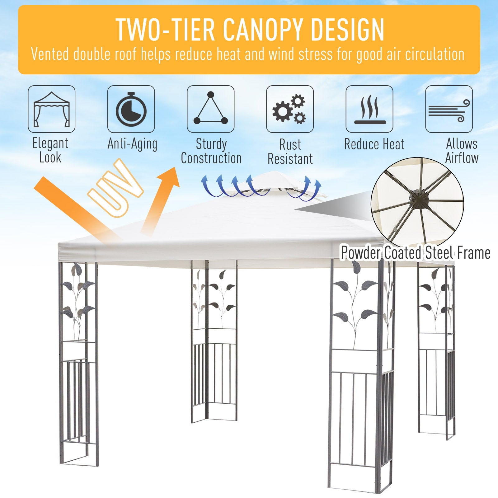 Two-Tier Canopy: The PA coated polyester canopy protects the interior from light rain and direct sunlight. The top vent allows air to escape easily. Eight aluminum grommets help prevent water buildup on the metal gazebo.
