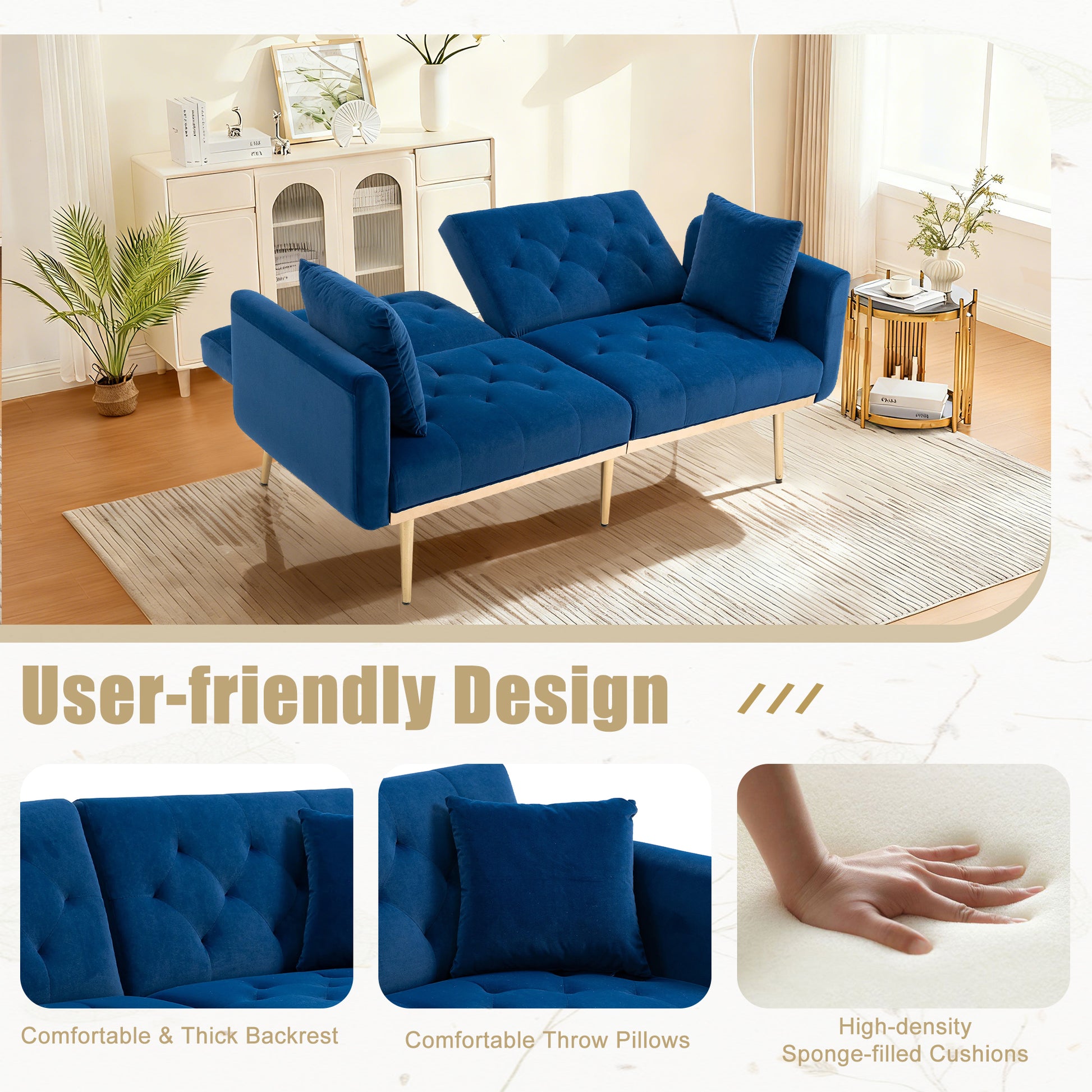 Supported by a durable solid wood frame, featuring thickened padded cushions and paired with eye-catching gold metal legs, it combines a stylish appearance with unshakable stability.