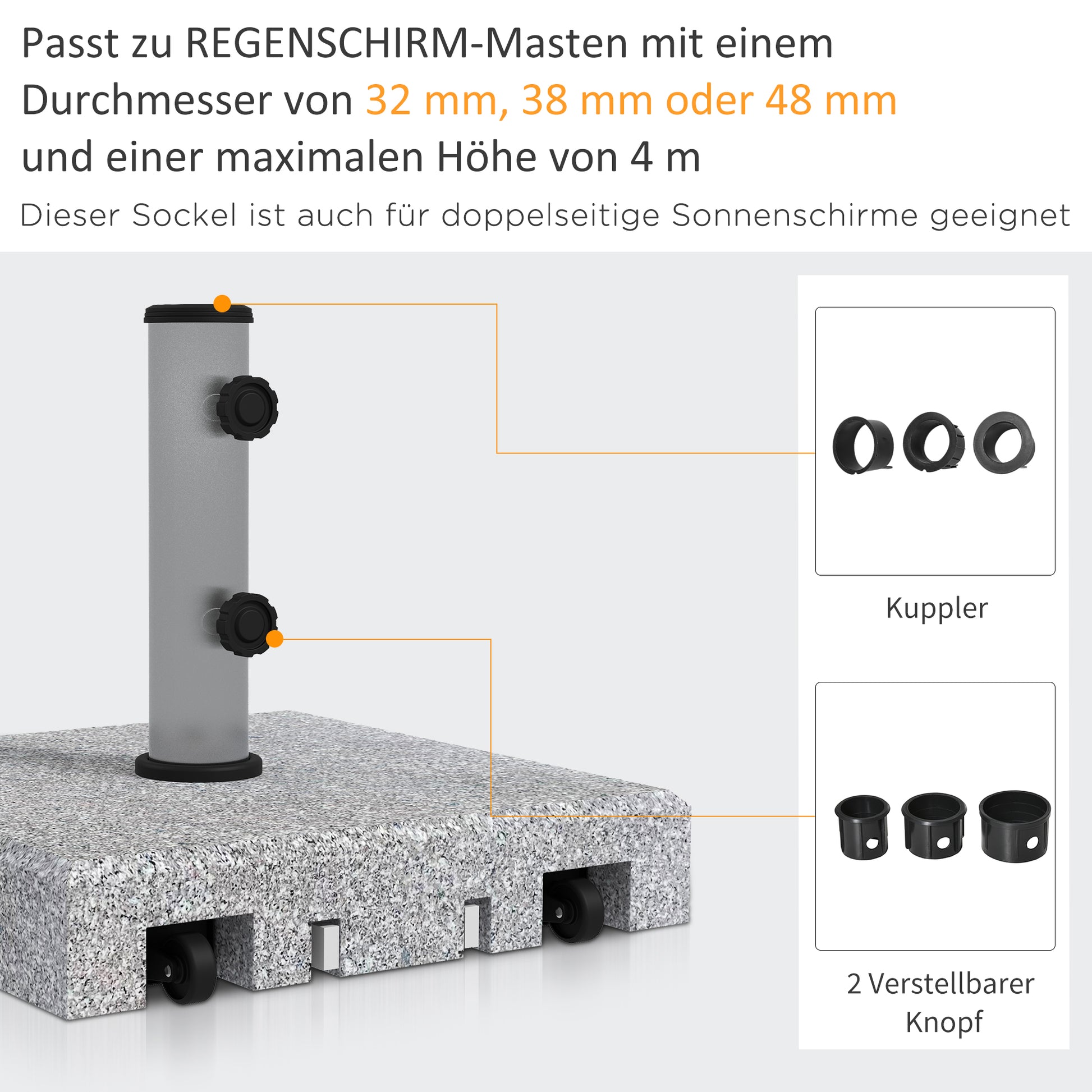 Suitable for various parasol sizes: This parasol base is suitable for parasols with a maximum height of 3 m and a pole diameter of 32 mm, 38 mm, or 48 mm. The parasol is easily attached to the base using two rotary knobs.