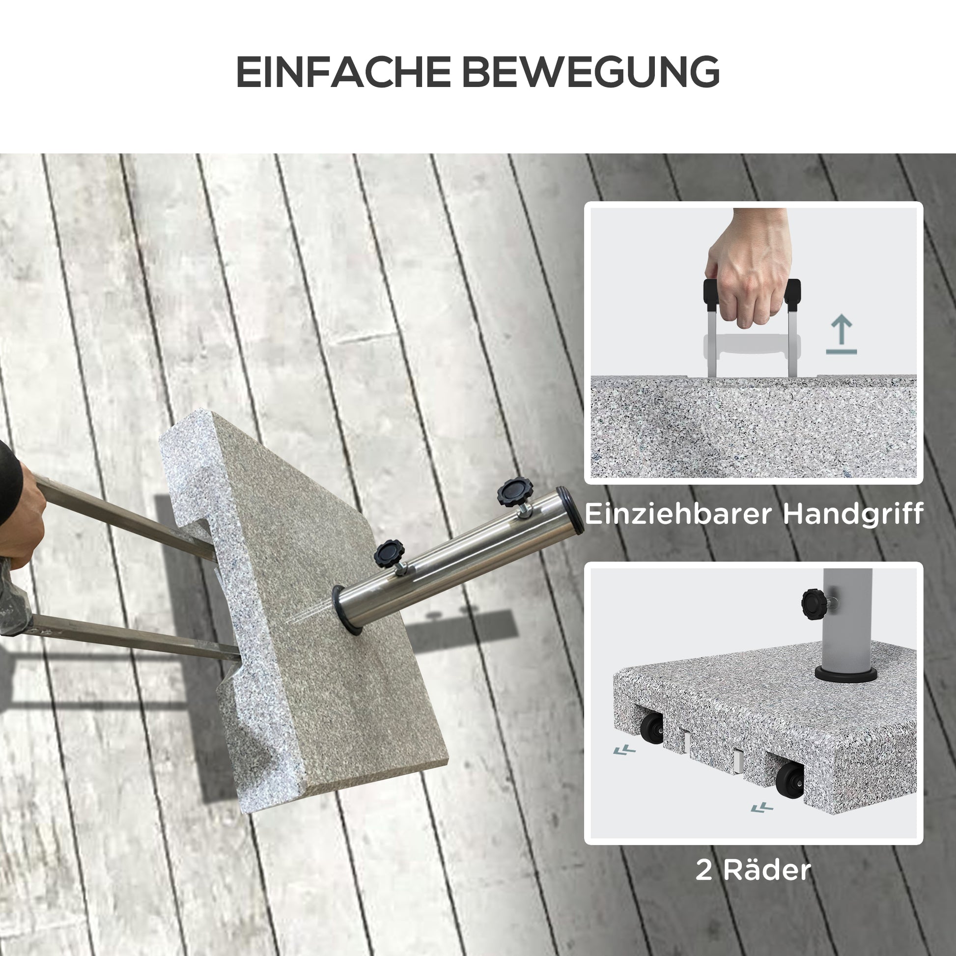 Easy transport: The garden parasol base features a retractable handle that is neatly concealed under the square base when not in use. Thanks to the two wheels, the base can be moved effortlessly – ideal for adjusting the parasol's position to the sun's position.