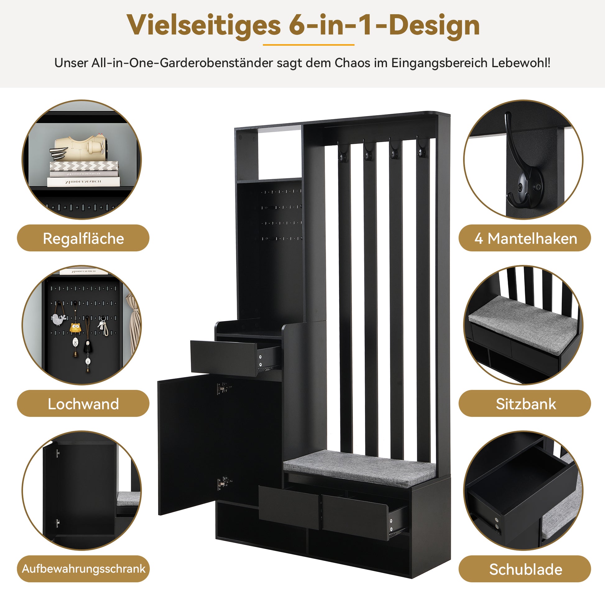 Hallway coat rack with padded storage bench and pegboard, 4 hooks, black