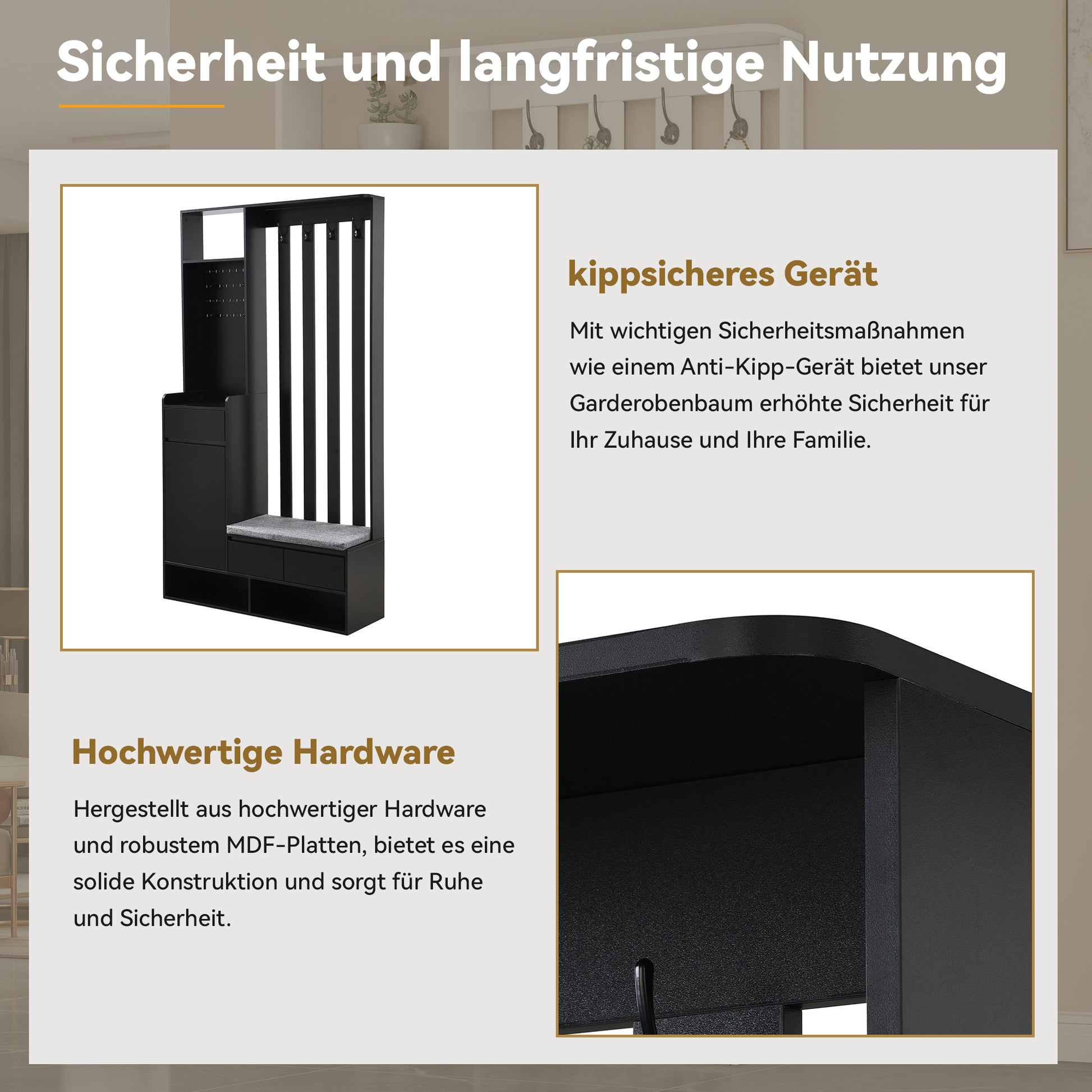 Our all-in-one entryway tree bids farewell to clutter in the entryway! This elegant unit consists of a shelf, a cabinet, a storage area, a drawer, 4 coat hooks, and a bench, providing a complete solution for a tidy and organized entryway.