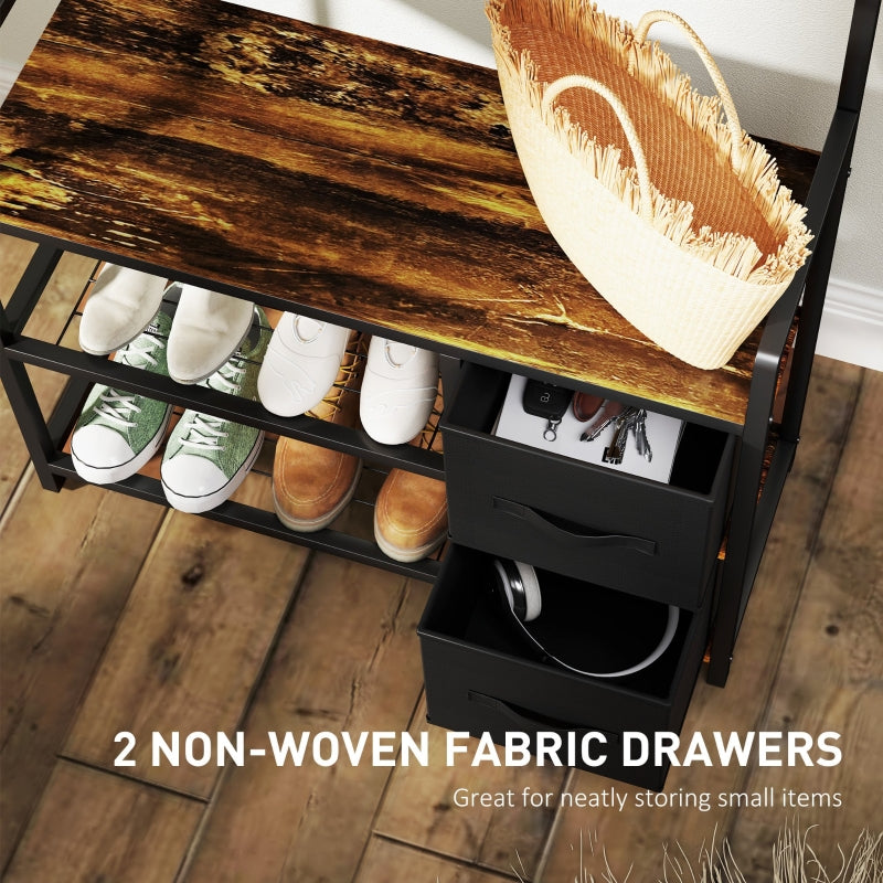 4-in-1 Design: This entryway coat rack combines 15 coat hooks, a bench, two shoe racks, and two removable fabric drawers—a handy spot for keeping outerwear and accessories together. Ten of the hooks are removable. The shoe rack holds a maximum of four pairs of shoes.