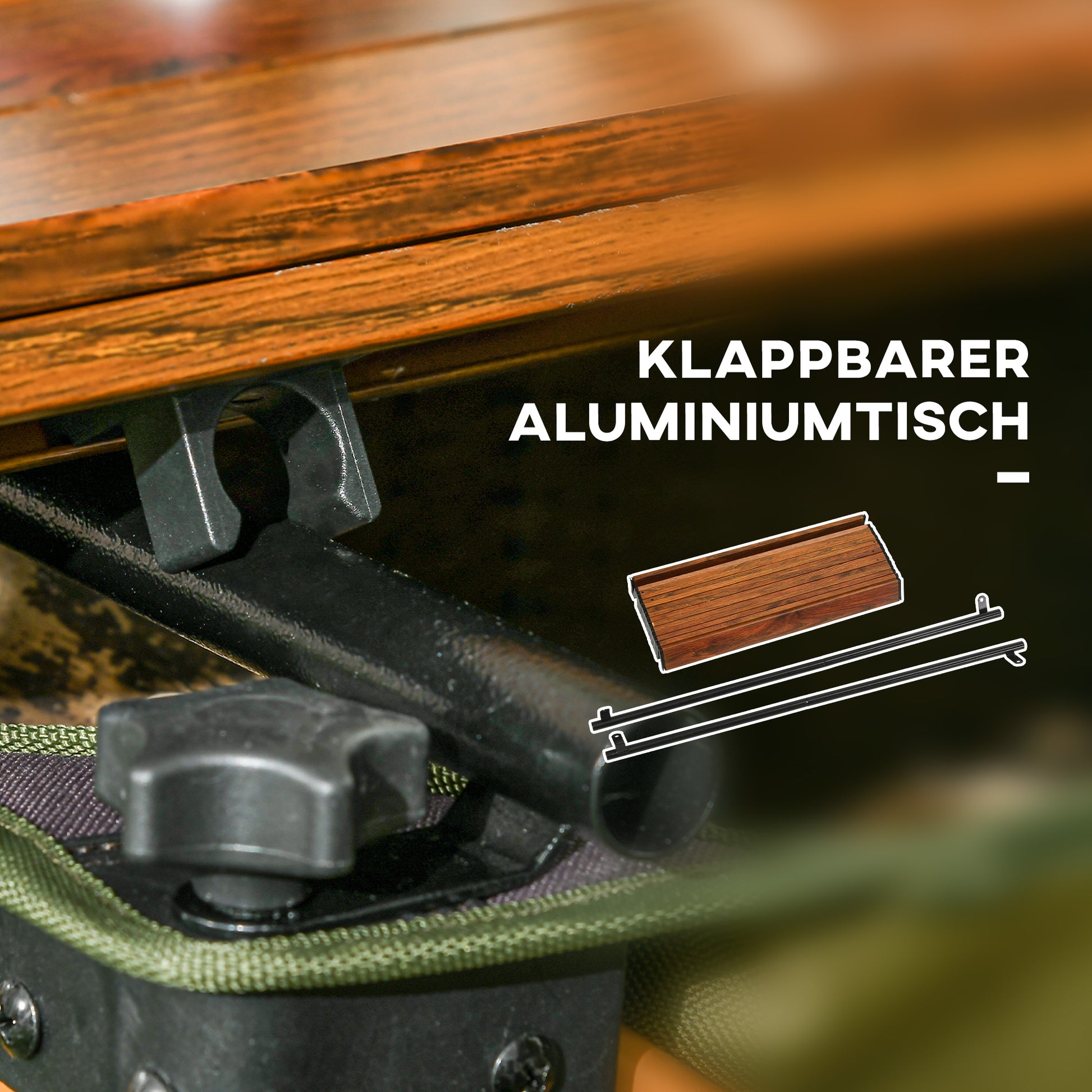 Foldable aluminum table: The practical lid transforms into a foldable aluminum table that can be used for work or as a picnic table. When not in use, it folds up to save space.