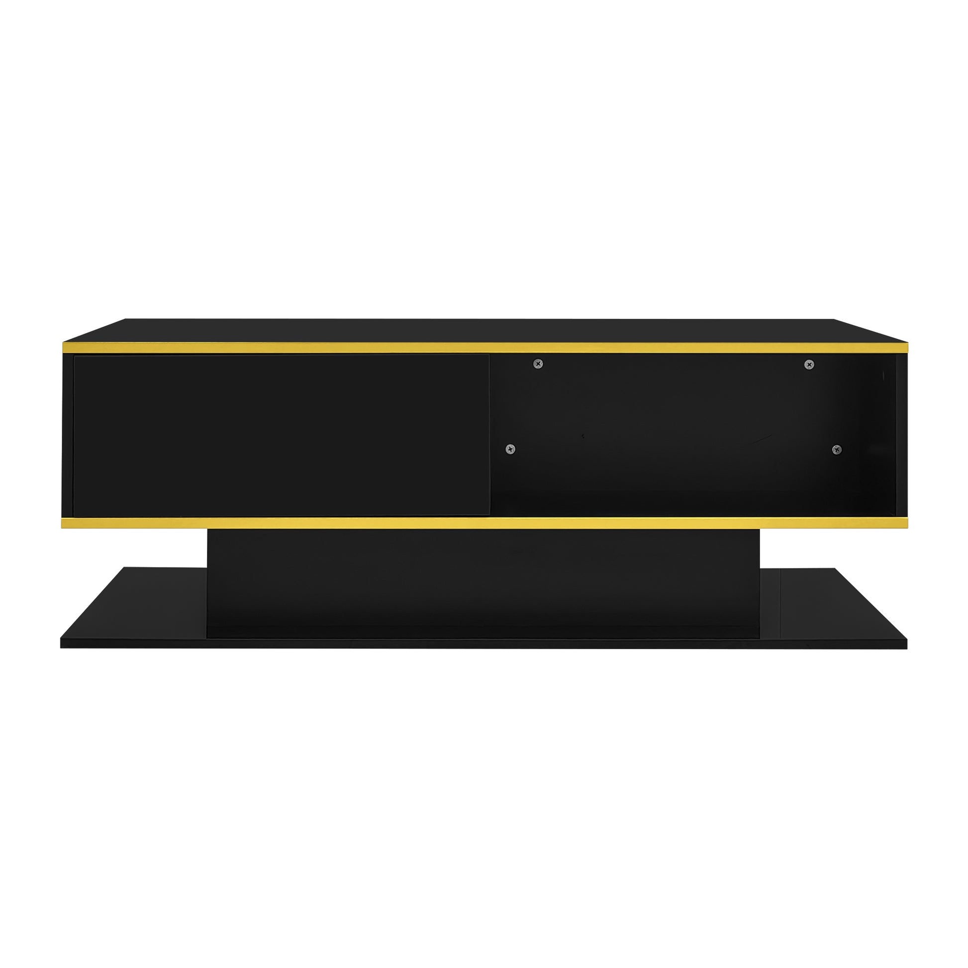 This modern coffee table, with its unique design concept that perfectly blends practical functionality with artistic beauty, has become the centerpiece of any living room. The generous tabletop (100 × 50 × 40 cm) offers ample storage space for coffee accessories, decorative items, or books and magazines. The high-gloss surface reflects captivating light and shadow effects with exquisite gold decorative lines, adding a touch of luxury to any room. The specially designed LED ambient light strip allows for multi-colored and stepless brightness control. This lets you freely switch the lighting effects to suit your mood, creating a warm, romantic atmosphere or a modern, dynamic ambiance. Three drawers and open compartments provide storage for remote controls, snacks, and small items, helping to keep your living room tidy and organized. This coffee table combines aesthetics and functionality, adding the perfect finishing touch to modern living spaces.