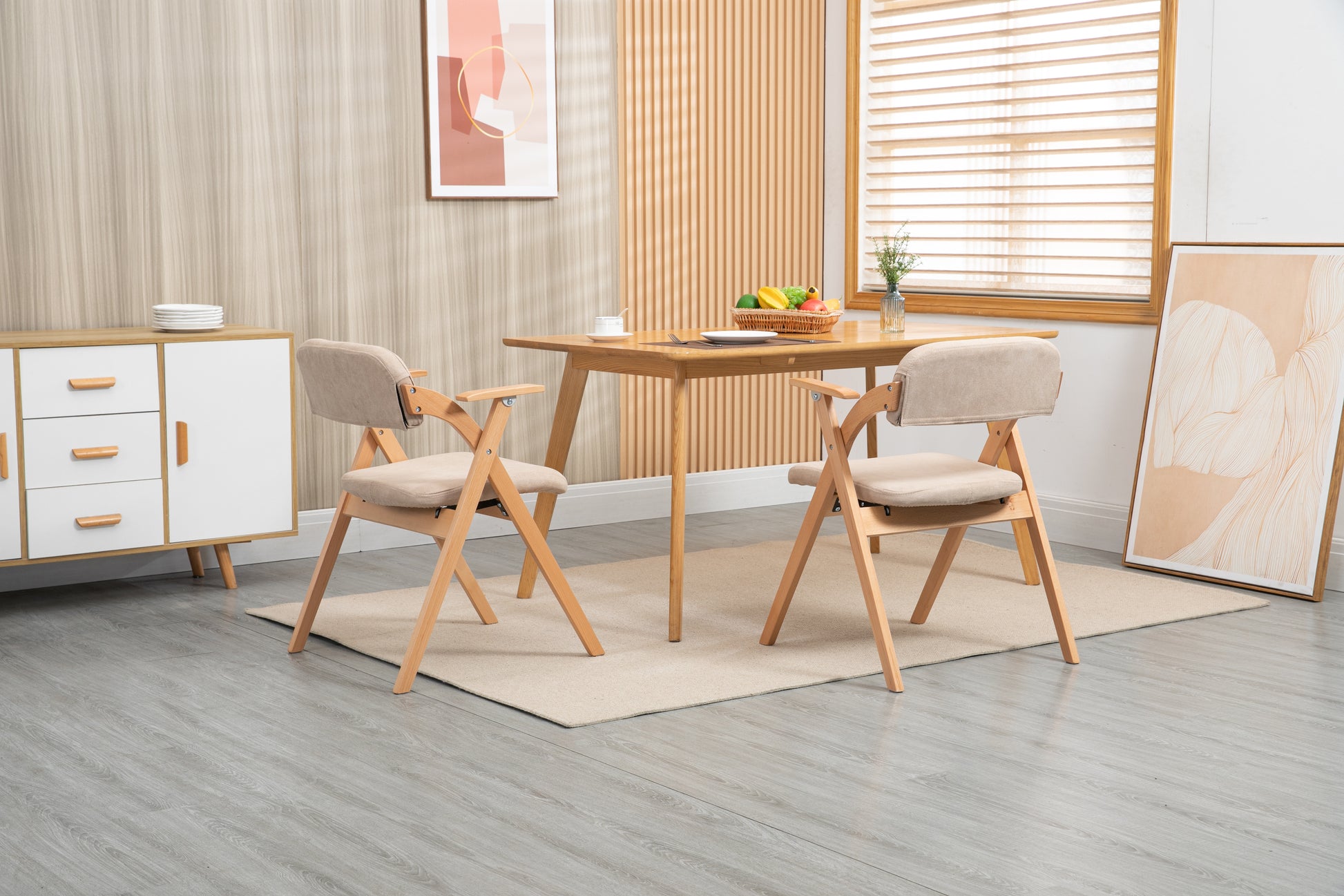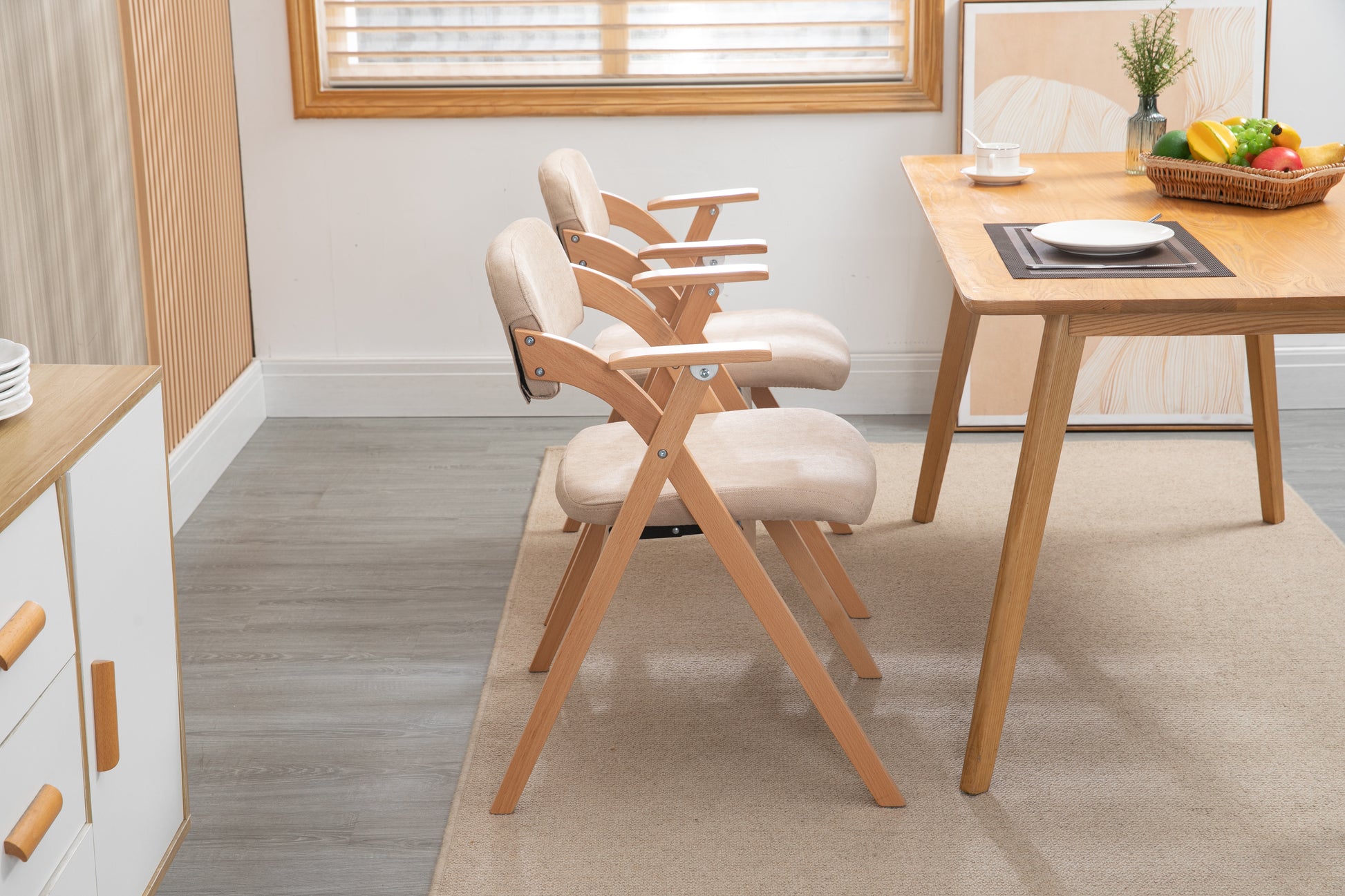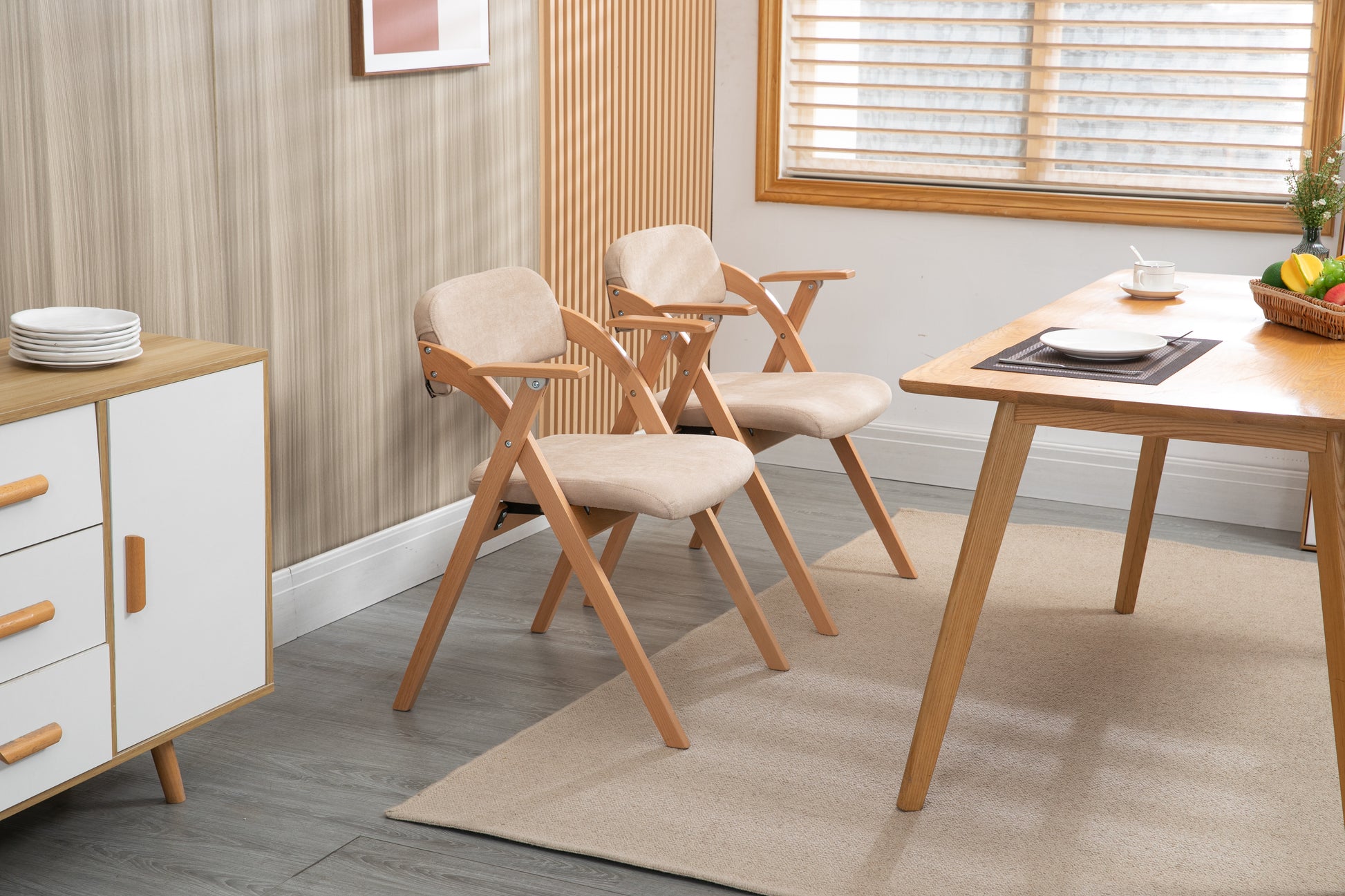 HOMEFUN Folding Dining Chairs, Padded Stackable with Armrest (Set of 2), Wooden Khaki