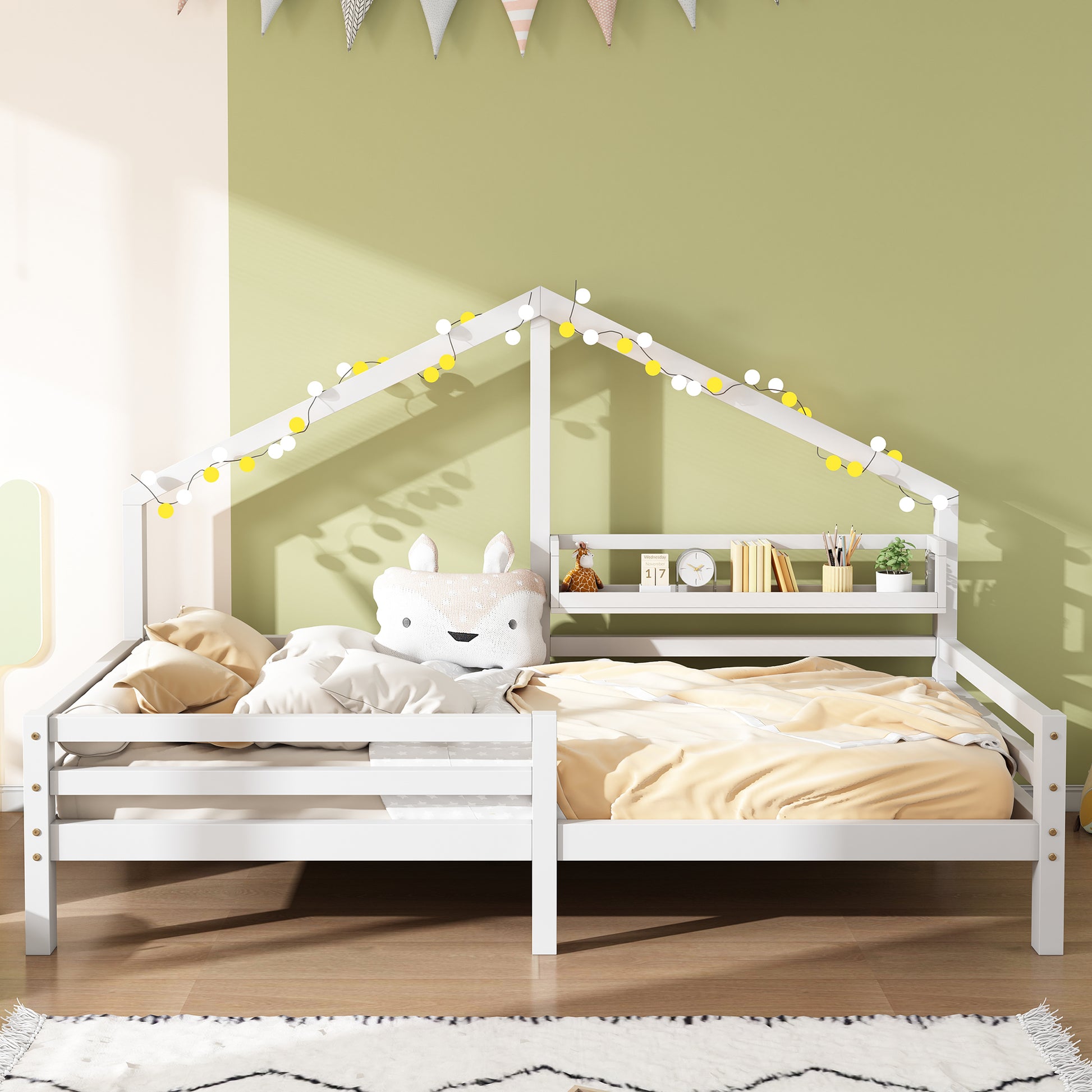 A shelf at the back of the bed provides storage for decorations, clocks, books, and other small items. Thanks to the pointed shelf and the chimney breast, this bed resembles a tiny house. This design is very childlike and caters to children's preferences.