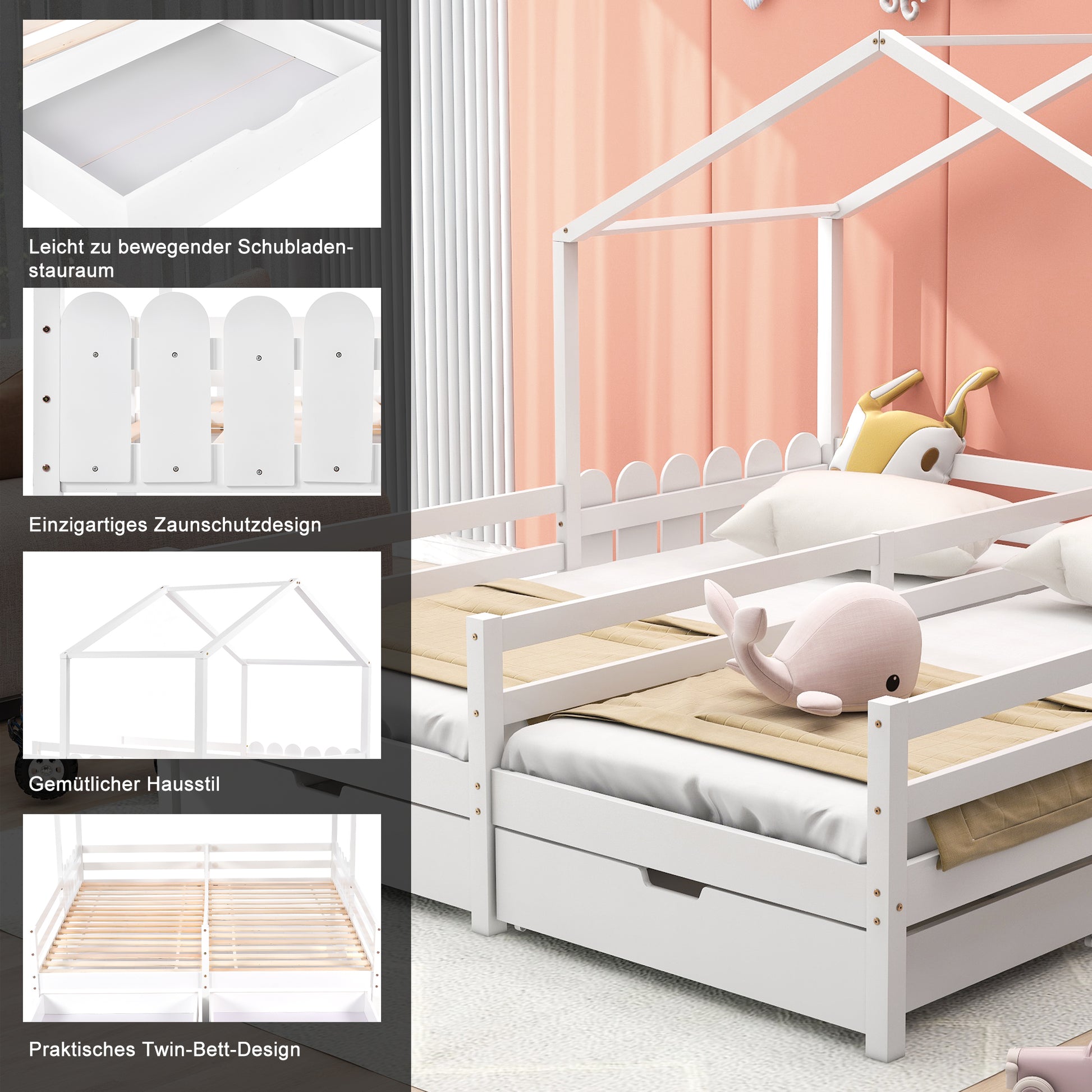 This double house bed with a fence offers a spacious and comfortable sleeping area, along with practical storage drawers. The lattice design at the headboard ensures safety and adds a charming style. The drawers provide convenient storage for bedding, clothes, and other items, keeping your bedroom tidy and organized. Combining functionality and beauty, this bed will make your bedroom both comfortable and stylish.