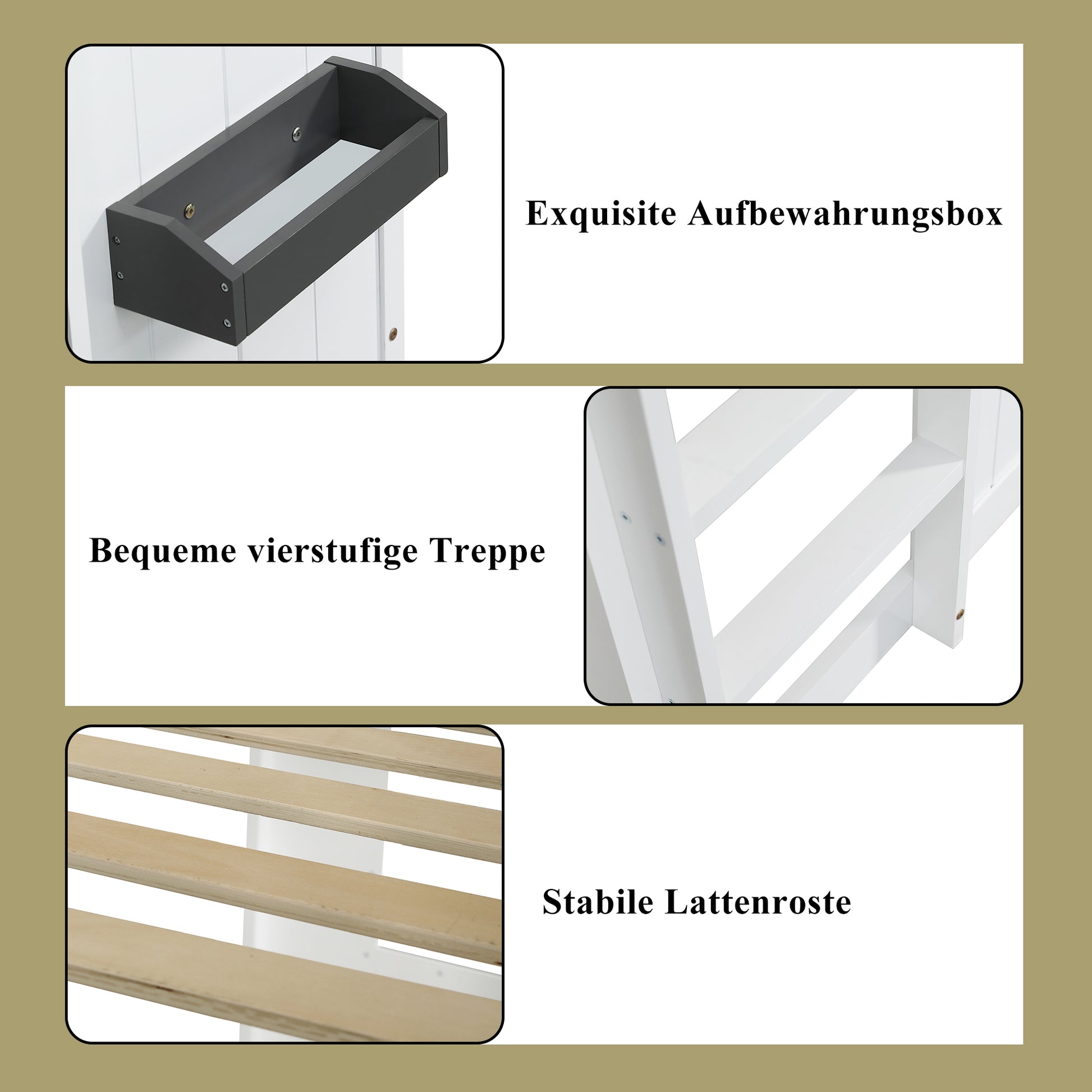 The bunk bed features two attractive gray windows, and the overall design provides both storage space, privacy, and air circulation. The lower bunk is supplied without a slatted base, and the space underneath can be flexibly used for storage, a play area, or an extra sleeping space, making it ideal for a child's room. Next to the four-step straight ladder is a shelf for storing small toys. The upper bunk is protected by railings all around, a thoughtful design that prevents children from falling out of bed while sleeping, thus providing added safety for families. The combination of white and gray gives the bed a modern look and makes it a versatile color suitable for various room designs.